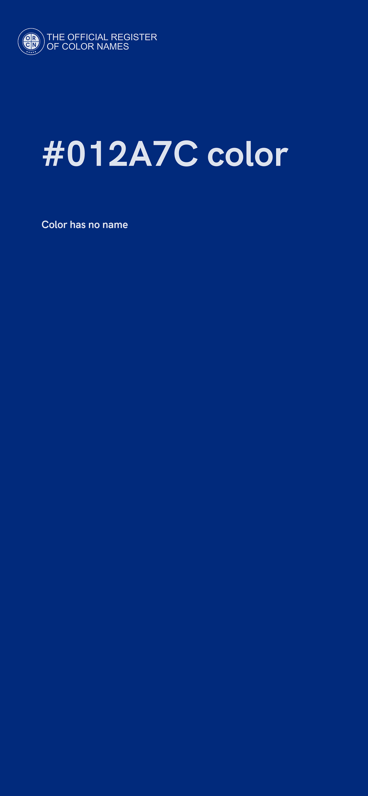 The digital color HEX #012A7C belongs to the Azure Color Family featuring Full Saturation (Saturation Family) and Neutral (Brightness Family).