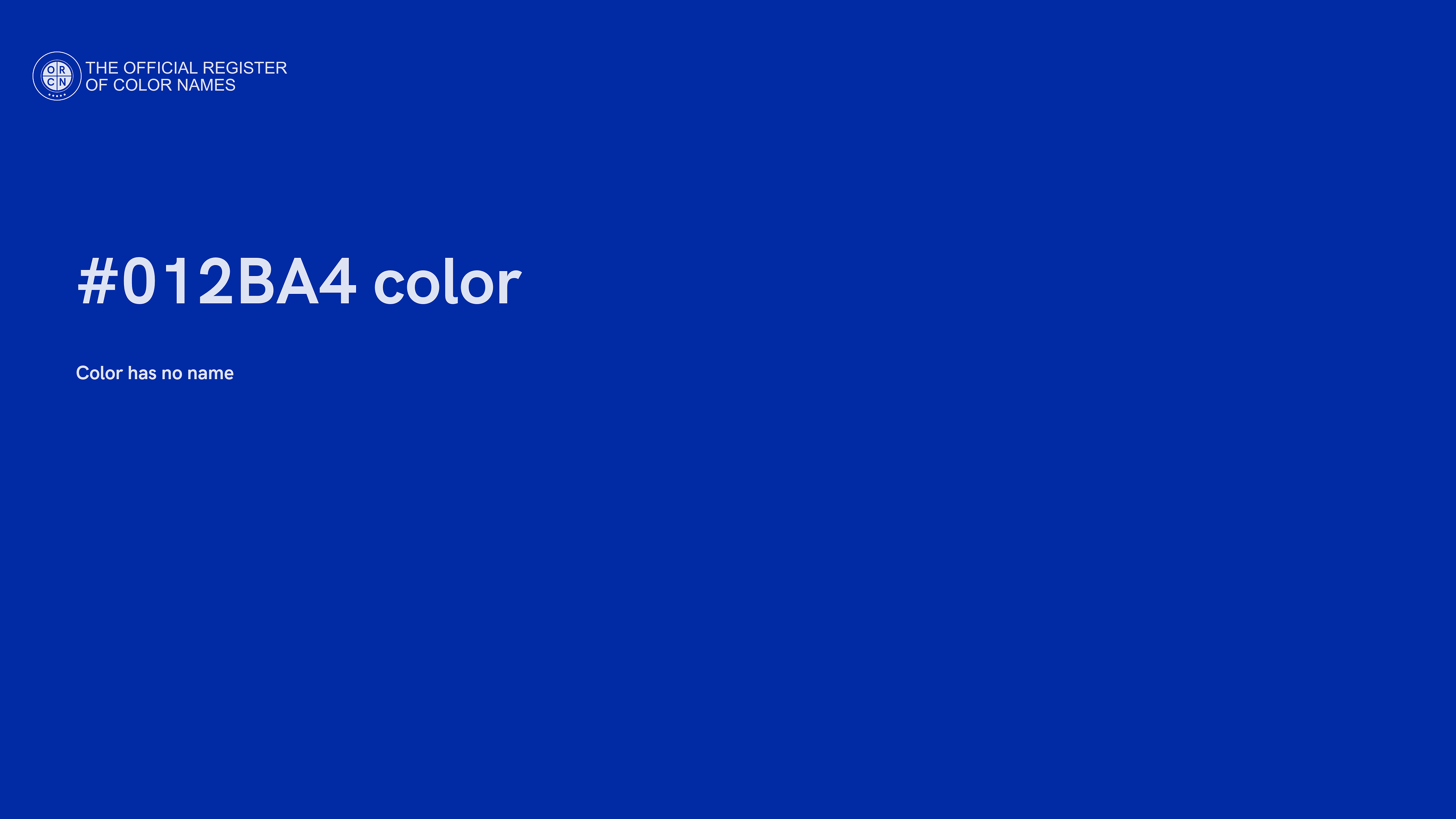 For printing in non digital world, #012BA4 is represented in CMYK as 64 Cyan, 47 Magenta, 0 Yellow, and 36 Black (Key) (C:64 M:47 Y:0 K:36).