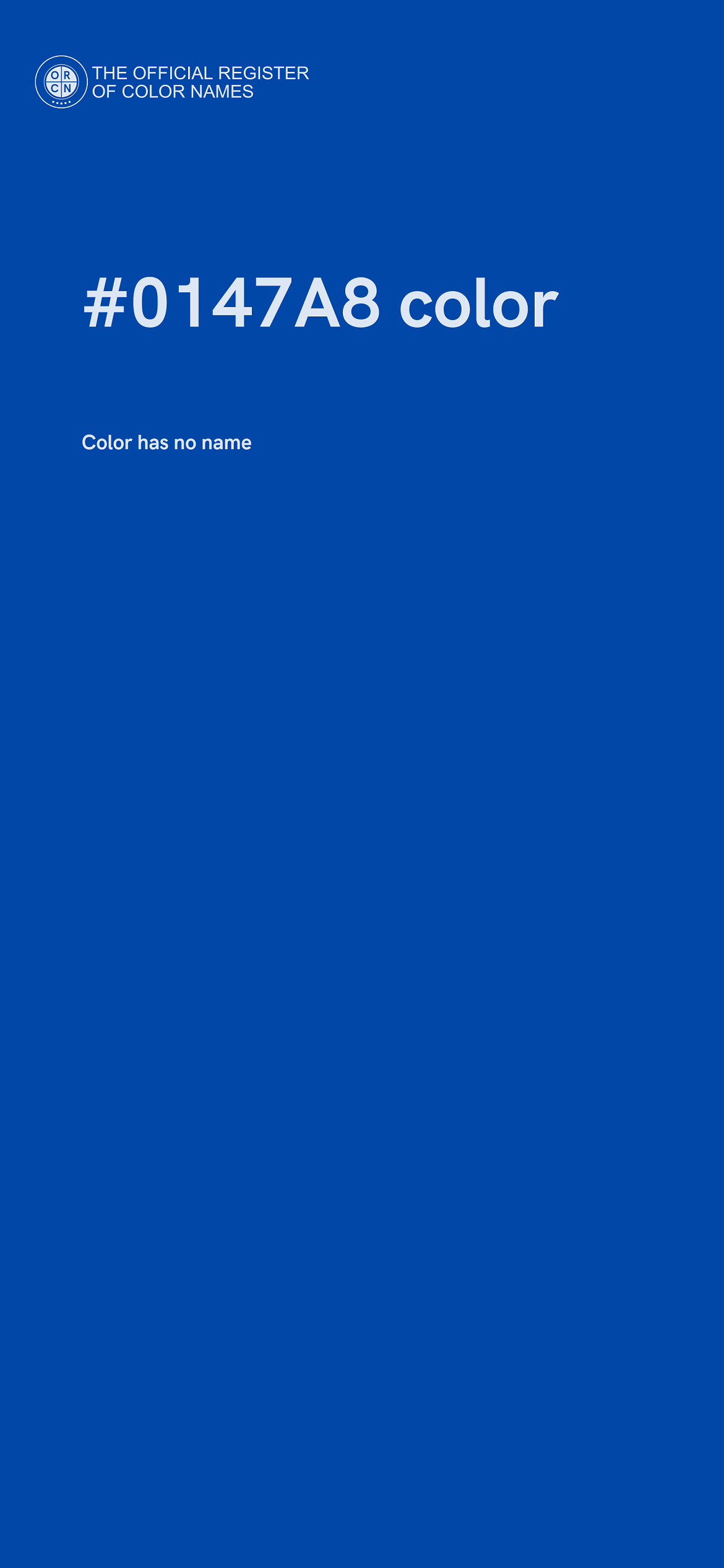 The digital color HEX #0147A8 belongs to the Azure Color Family featuring Full Saturation (Saturation Family) and Neutral (Brightness Family).