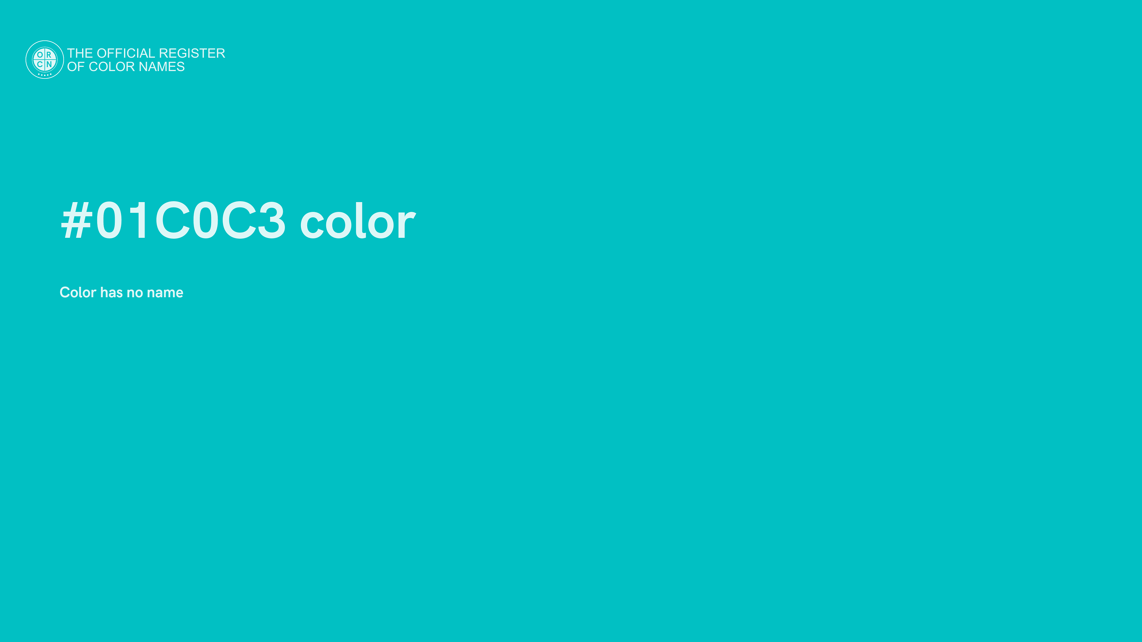 The digital color HEX #01C0C3 belongs to the Cyan Color Family featuring Full Saturation (Saturation Family) and Neutral (Brightness Family).