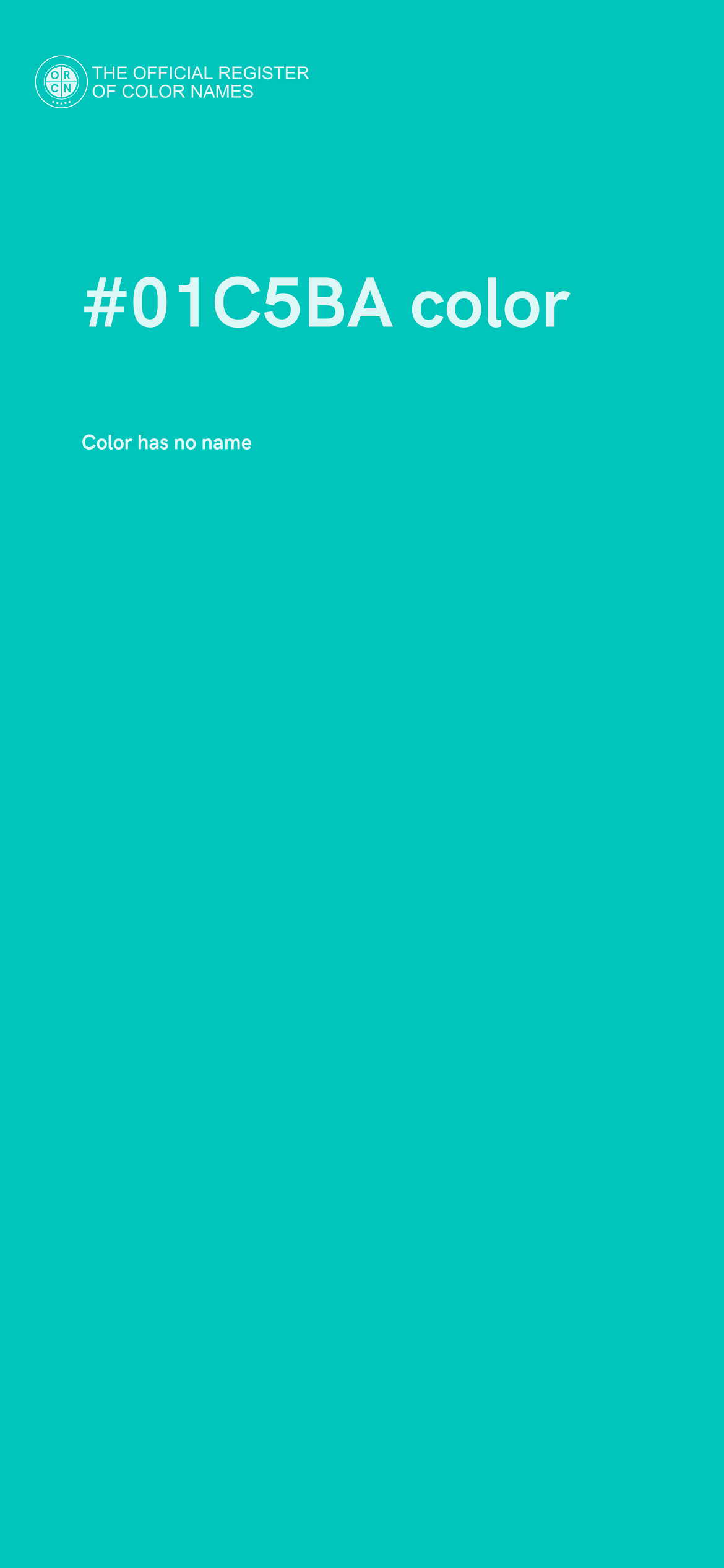 The digital color HEX #01C5BA belongs to the Cyan Color Family featuring Full Saturation (Saturation Family) and Neutral (Brightness Family).