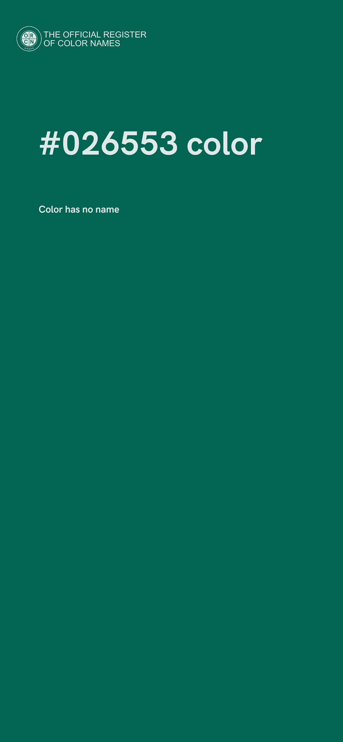 The digital color HEX #026553 belongs to the Cyan Color Family featuring Full Saturation (Saturation Family) and Dark (Brightness Family).