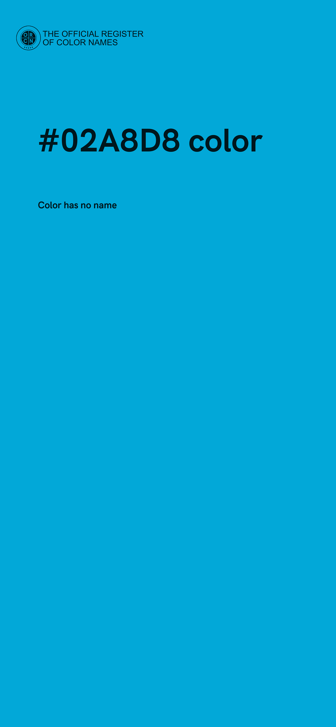 The digital color HEX #02A8D8 belongs to the Cyan Color Family featuring Full Saturation (Saturation Family) and Light (Brightness Family).