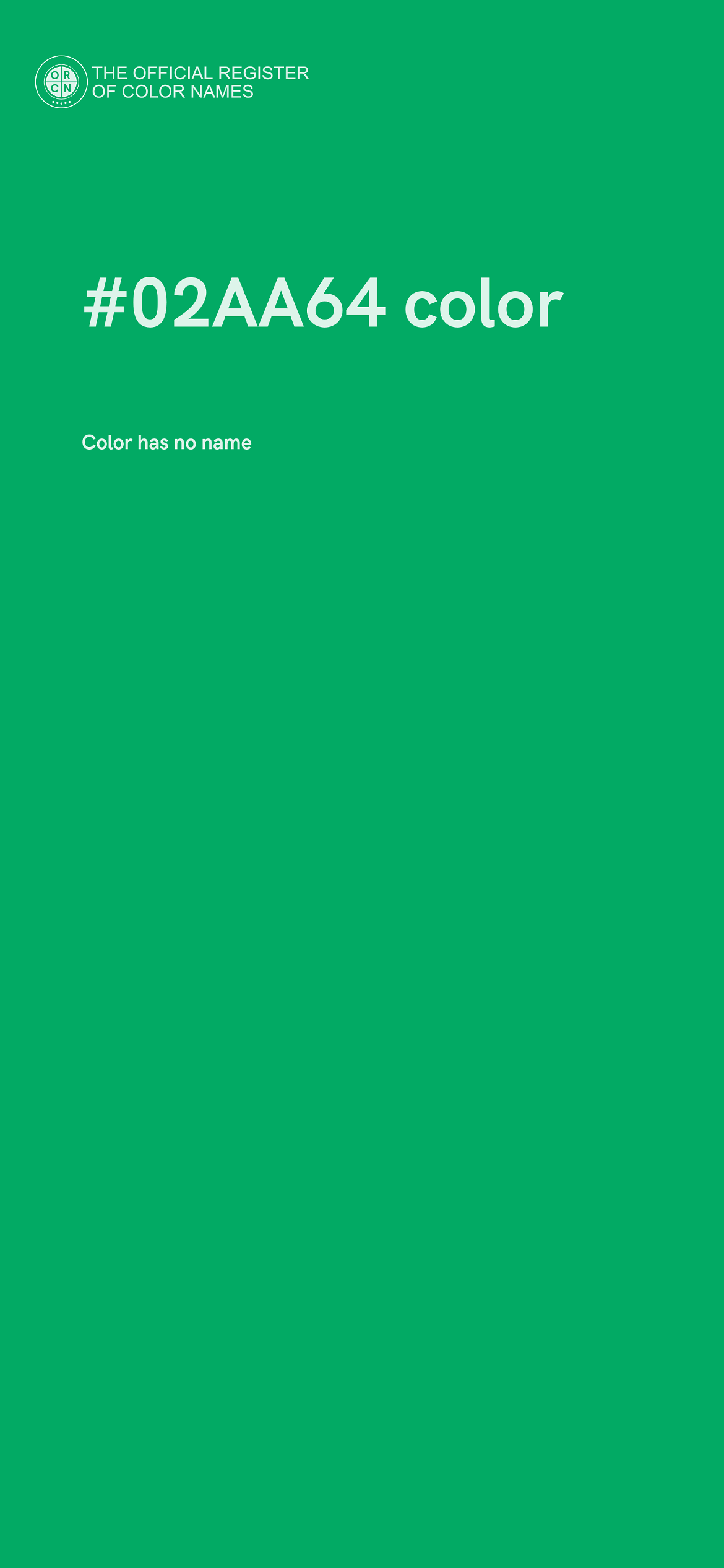 The digital color HEX #02AA64 belongs to the Spring Green Color Family featuring Full Saturation (Saturation Family) and Neutral (Brightness Family).