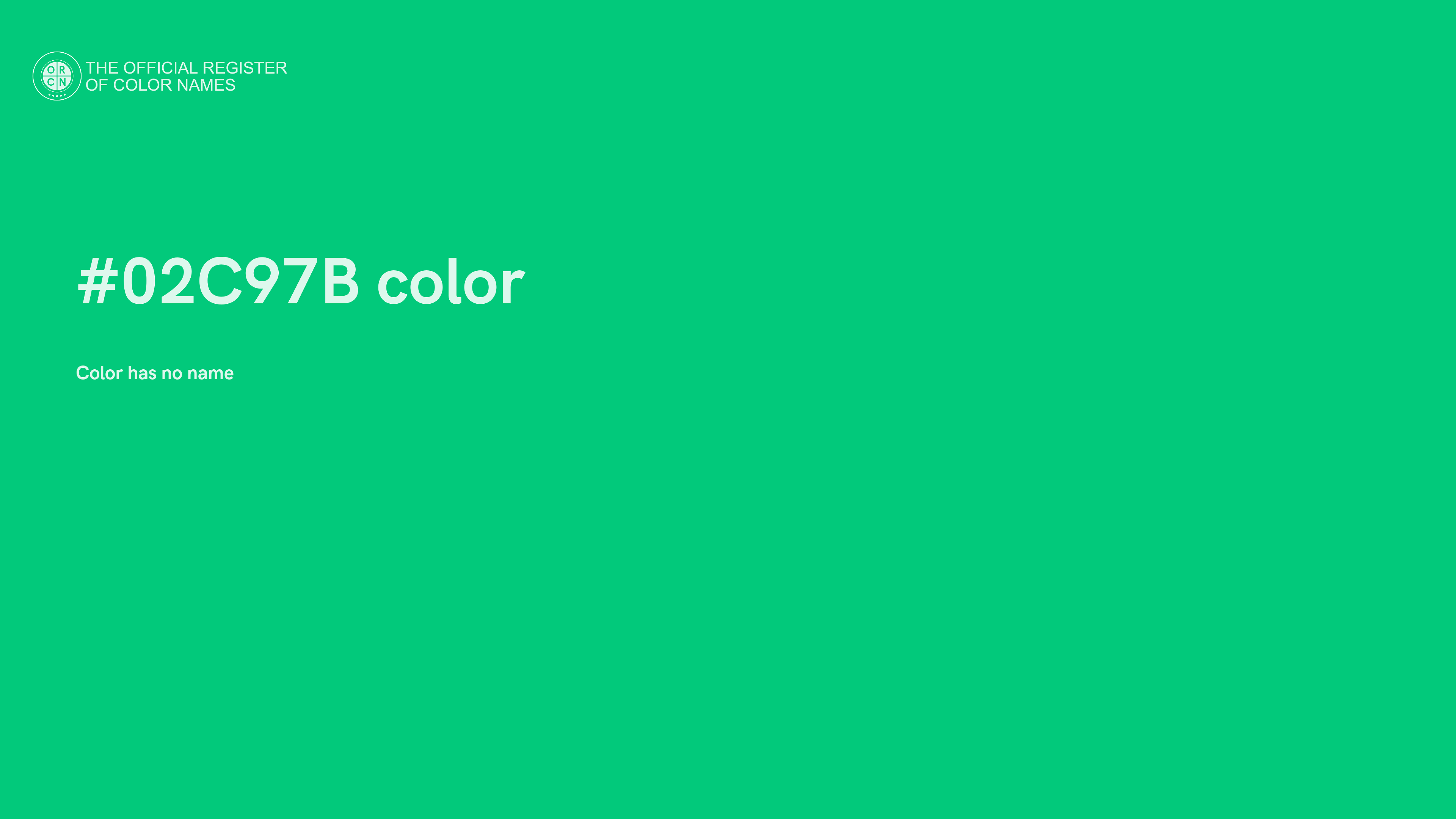 The digital color HEX #02C97B belongs to the Spring Green Color Family featuring Full Saturation (Saturation Family) and Light (Brightness Family).