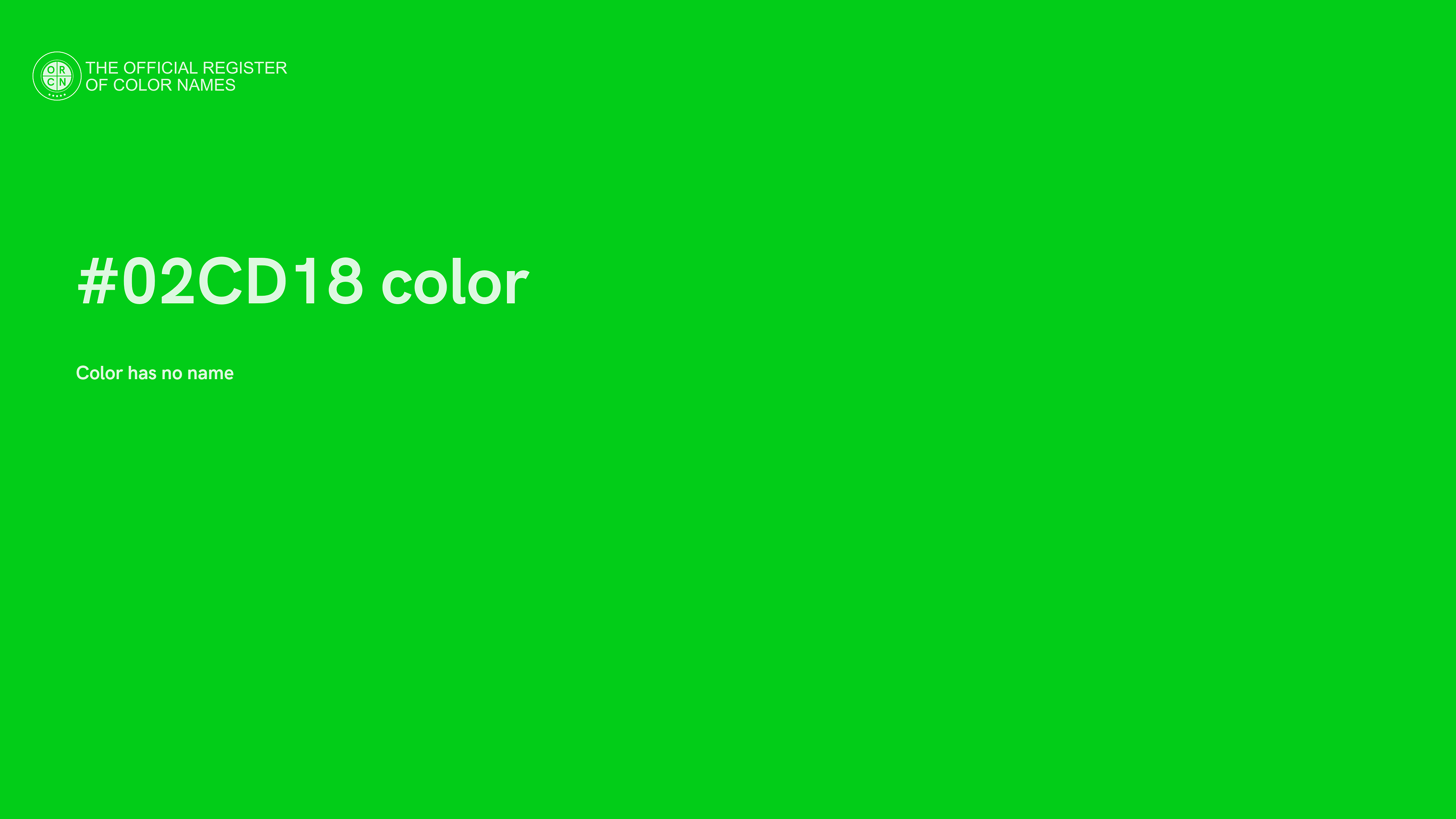 The digital color HEX #02CD18 belongs to the Green Color Family featuring Full Saturation (Saturation Family) and Light (Brightness Family).