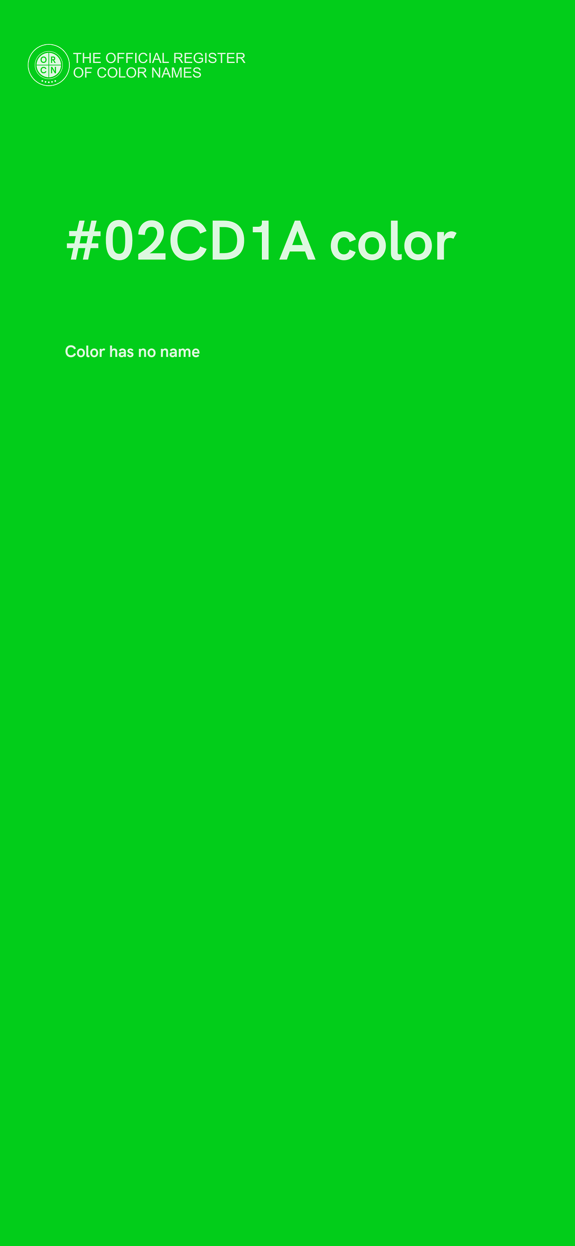 The digital color HEX #02CD1A belongs to the Green Color Family featuring Full Saturation (Saturation Family) and Light (Brightness Family).