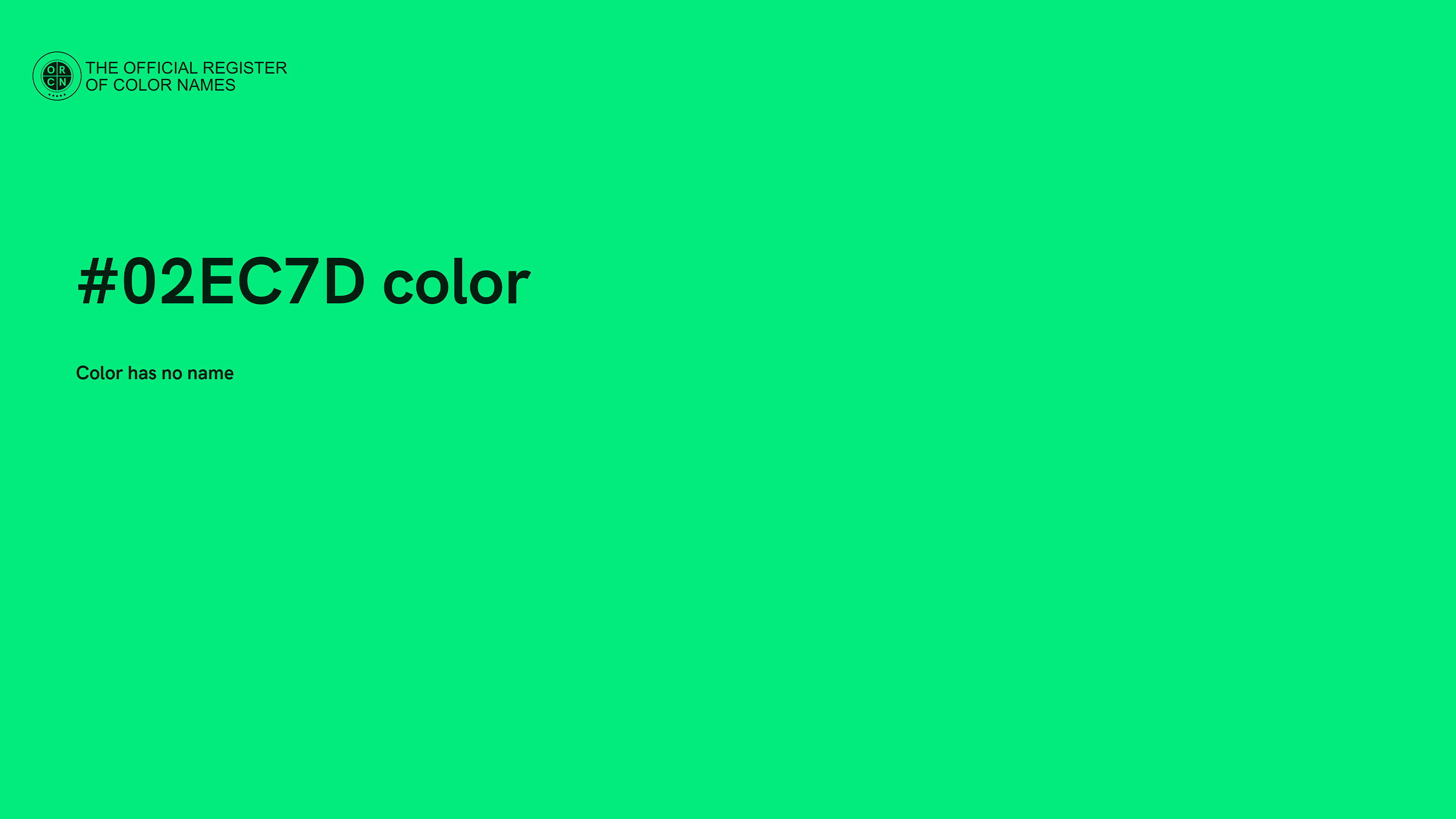 The digital color HEX #02EC7D belongs to the Spring Green Color Family featuring Full Saturation (Saturation Family) and Light (Brightness Family).