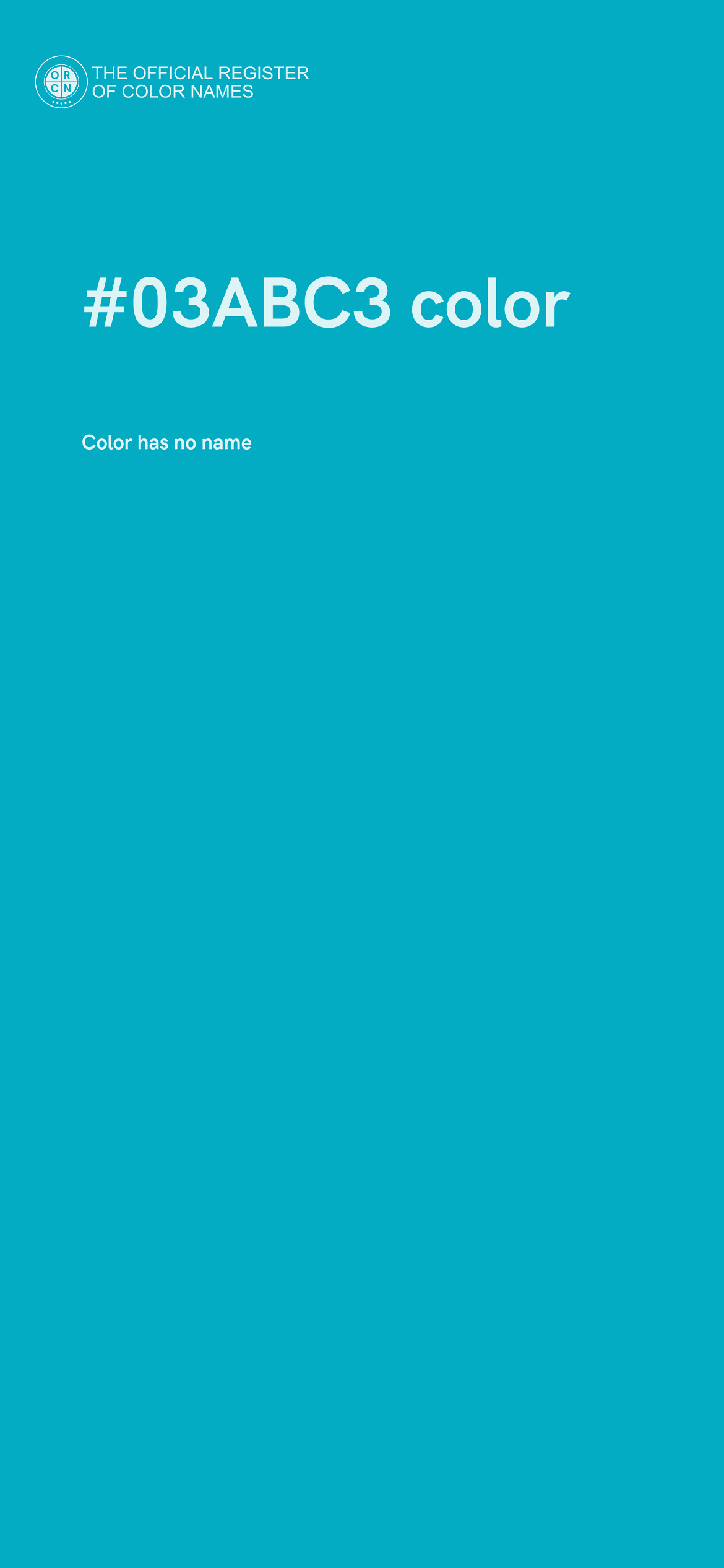The digital color HEX #03ABC3 belongs to the Cyan Color Family featuring Full Saturation (Saturation Family) and Neutral (Brightness Family).