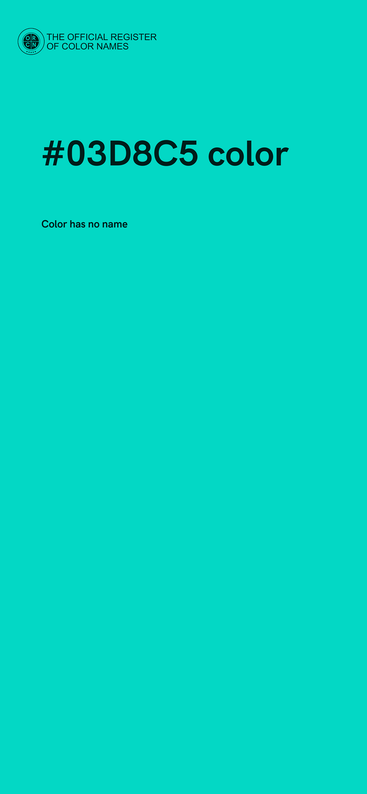 The digital color HEX #03D8C5 belongs to the Cyan Color Family featuring Full Saturation (Saturation Family) and Light (Brightness Family).