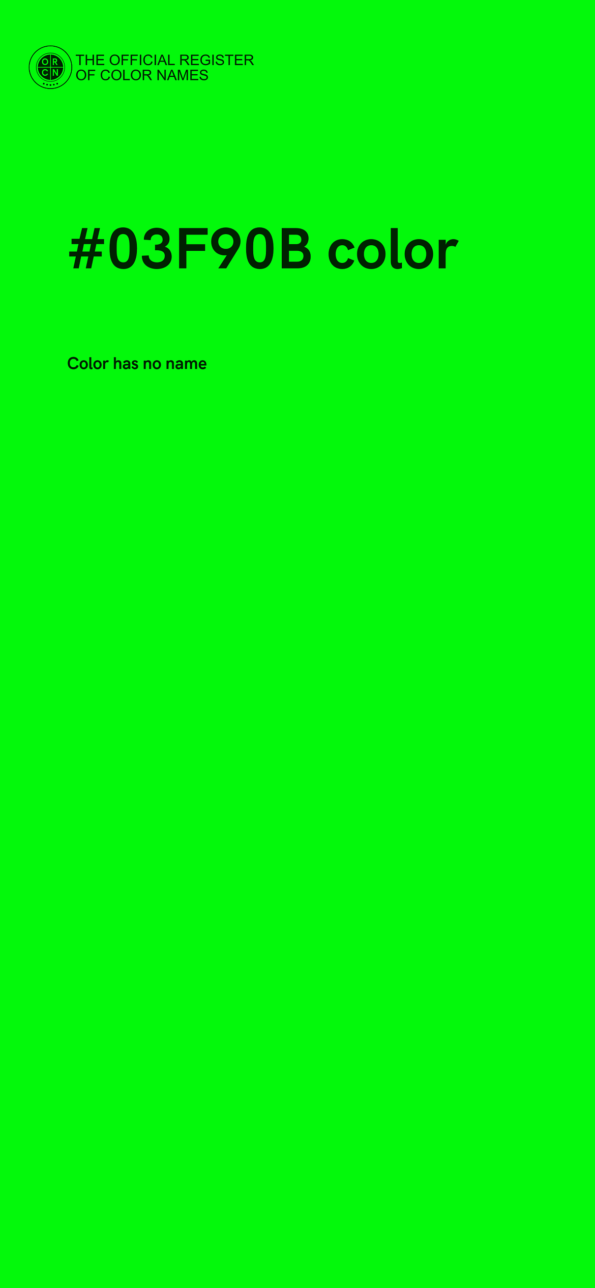 The digital color HEX #03F90B belongs to the Green Color Family featuring Full Saturation (Saturation Family) and Light (Brightness Family).
