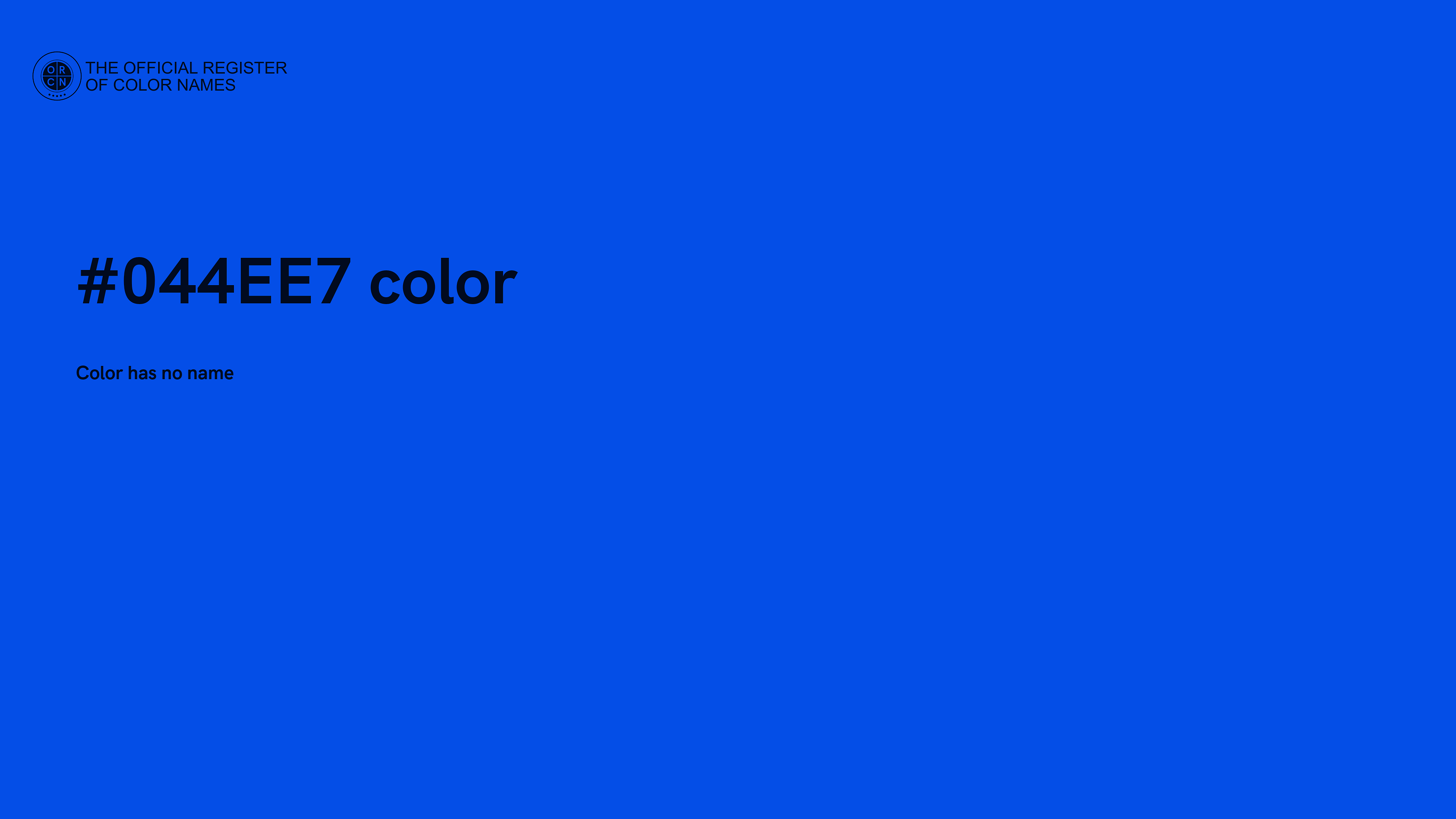 For printing in non digital world, #044EE7 is represented in CMYK as 89 Cyan, 60 Magenta, 0 Yellow, and 9 Black (Key) (C:89 M:60 Y:0 K:9).