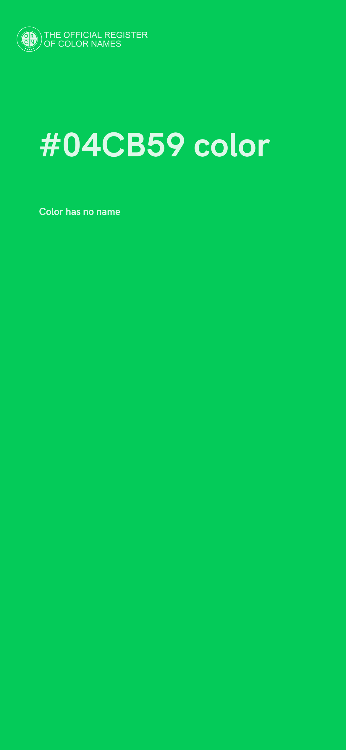 The digital color HEX #04CB59 belongs to the Spring Green Color Family featuring Full Saturation (Saturation Family) and Light (Brightness Family).