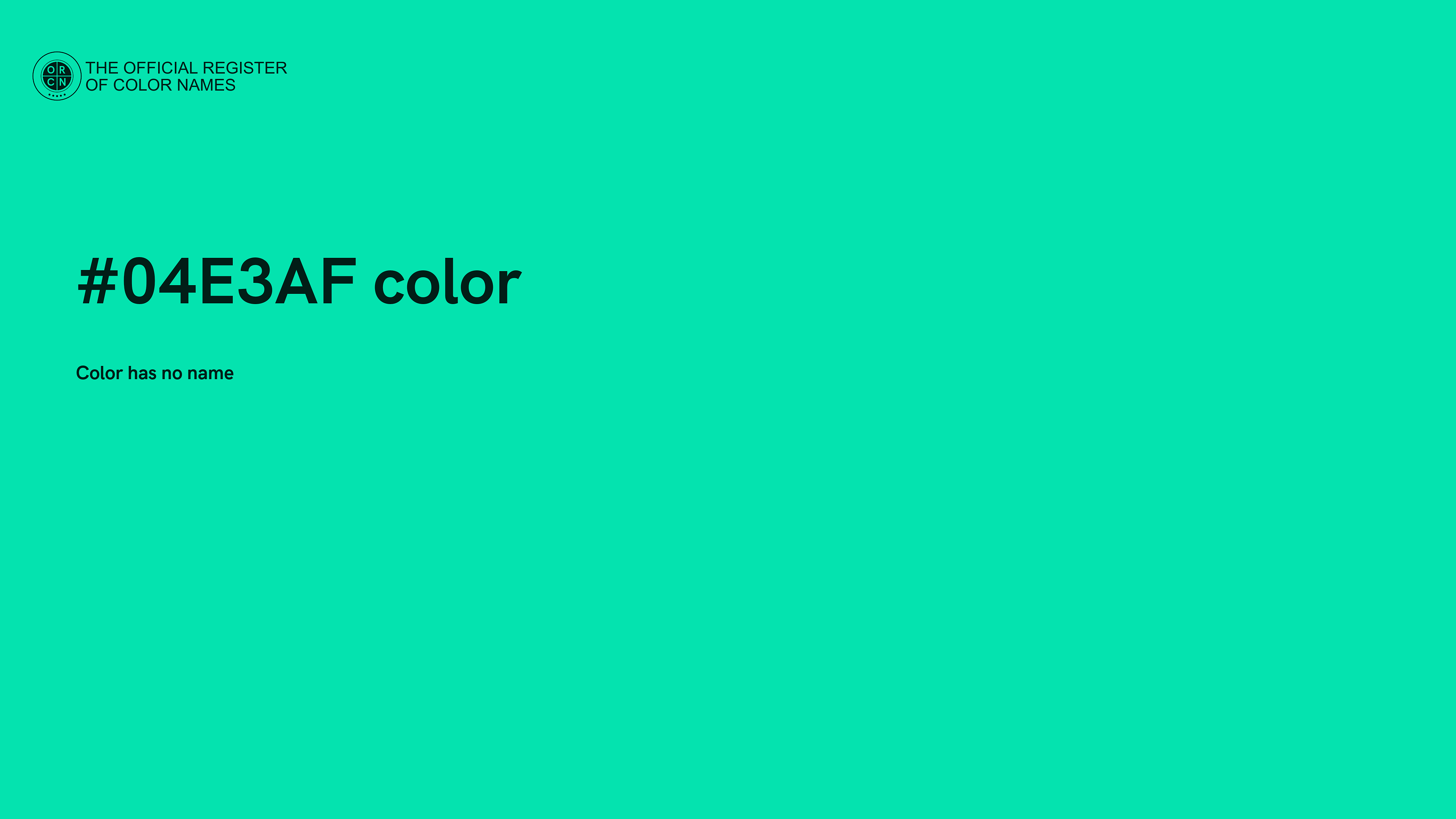 The digital color HEX #04E3AF belongs to the Cyan Color Family featuring Full Saturation (Saturation Family) and Light (Brightness Family).