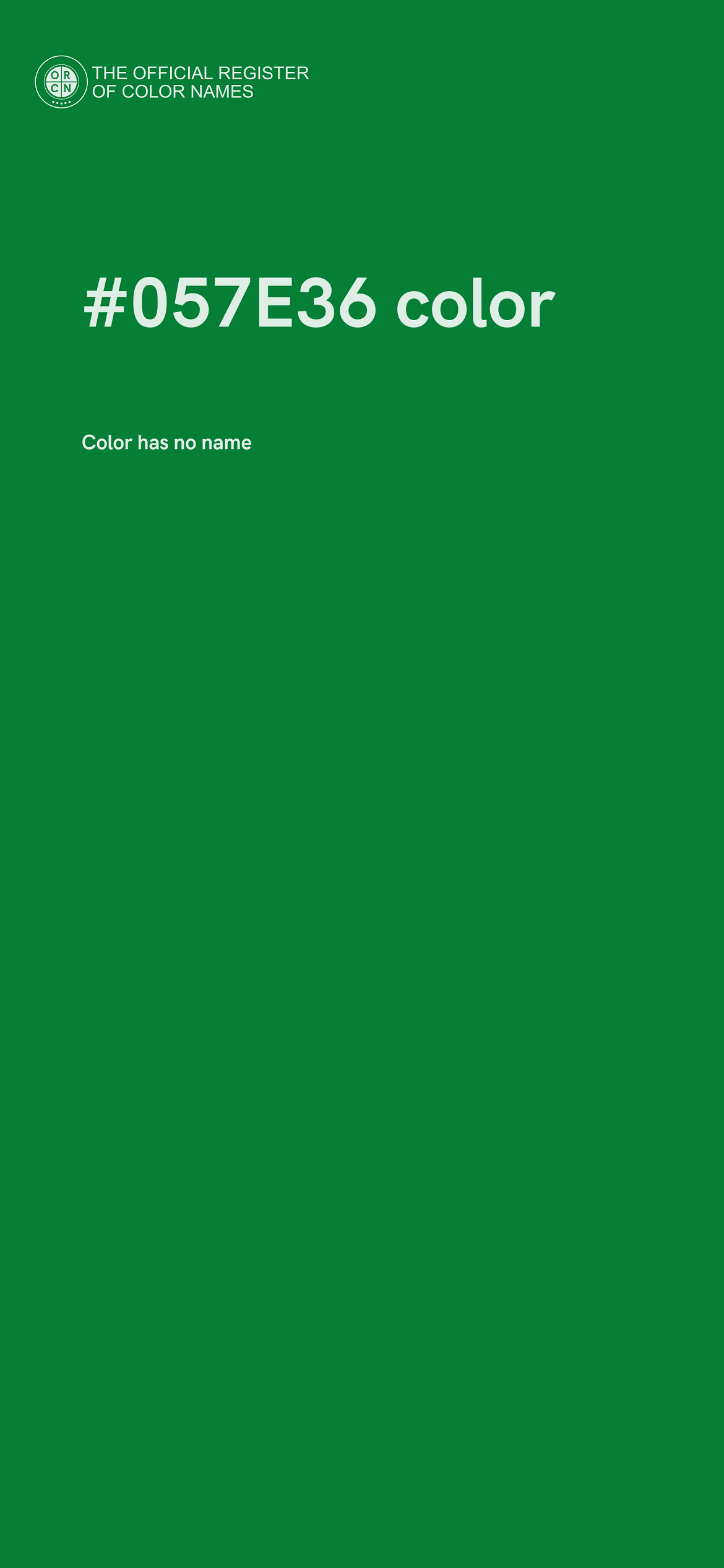 The digital color HEX #057E36 belongs to the Spring Green Color Family featuring Full Saturation (Saturation Family) and Neutral (Brightness Family).