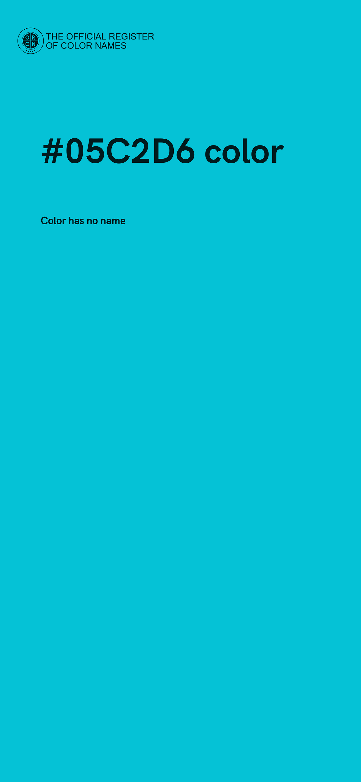 The digital color HEX #05C2D6 belongs to the Cyan Color Family featuring Full Saturation (Saturation Family) and Light (Brightness Family).