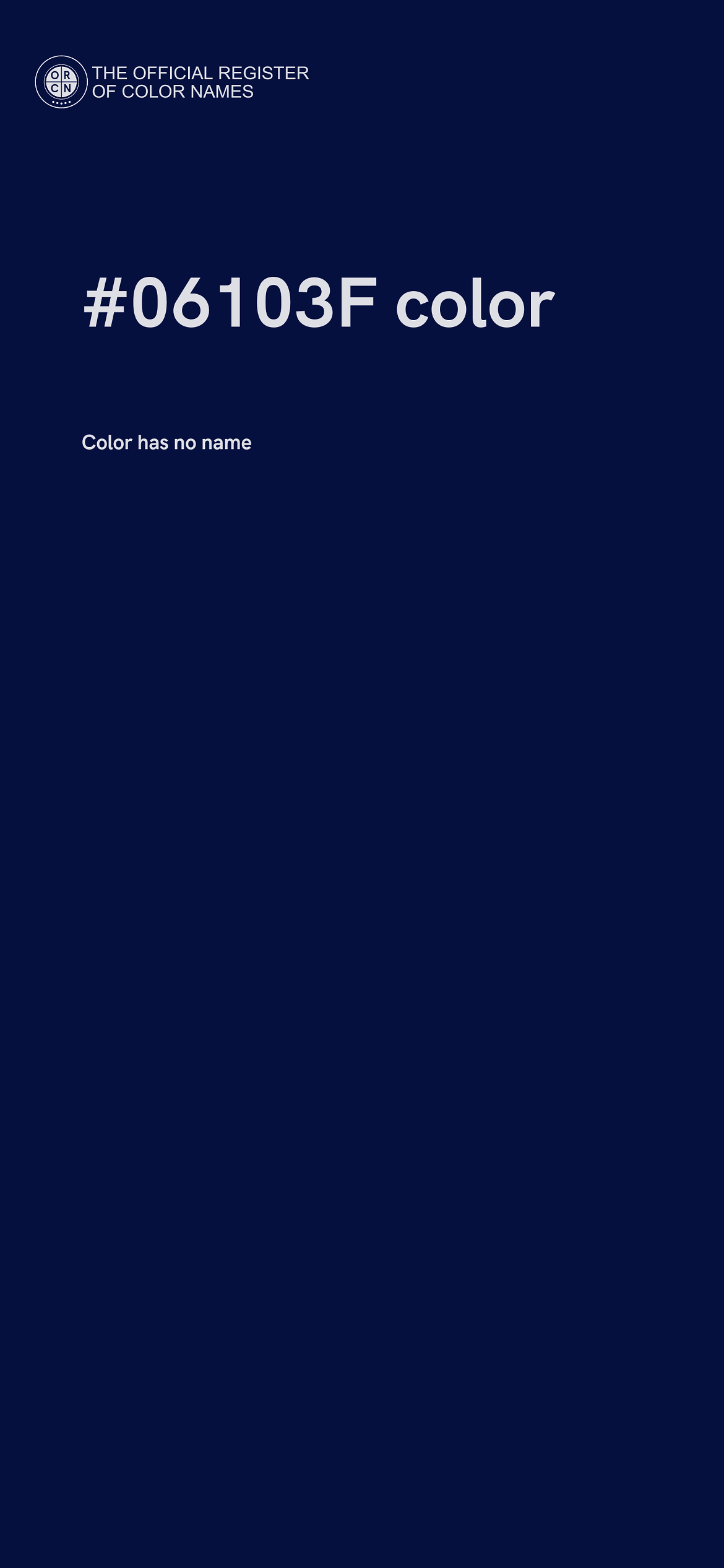 The digital color HEX #06103F belongs to the Blue Color Family featuring High Saturation (Saturation Family) and Dark (Brightness Family).