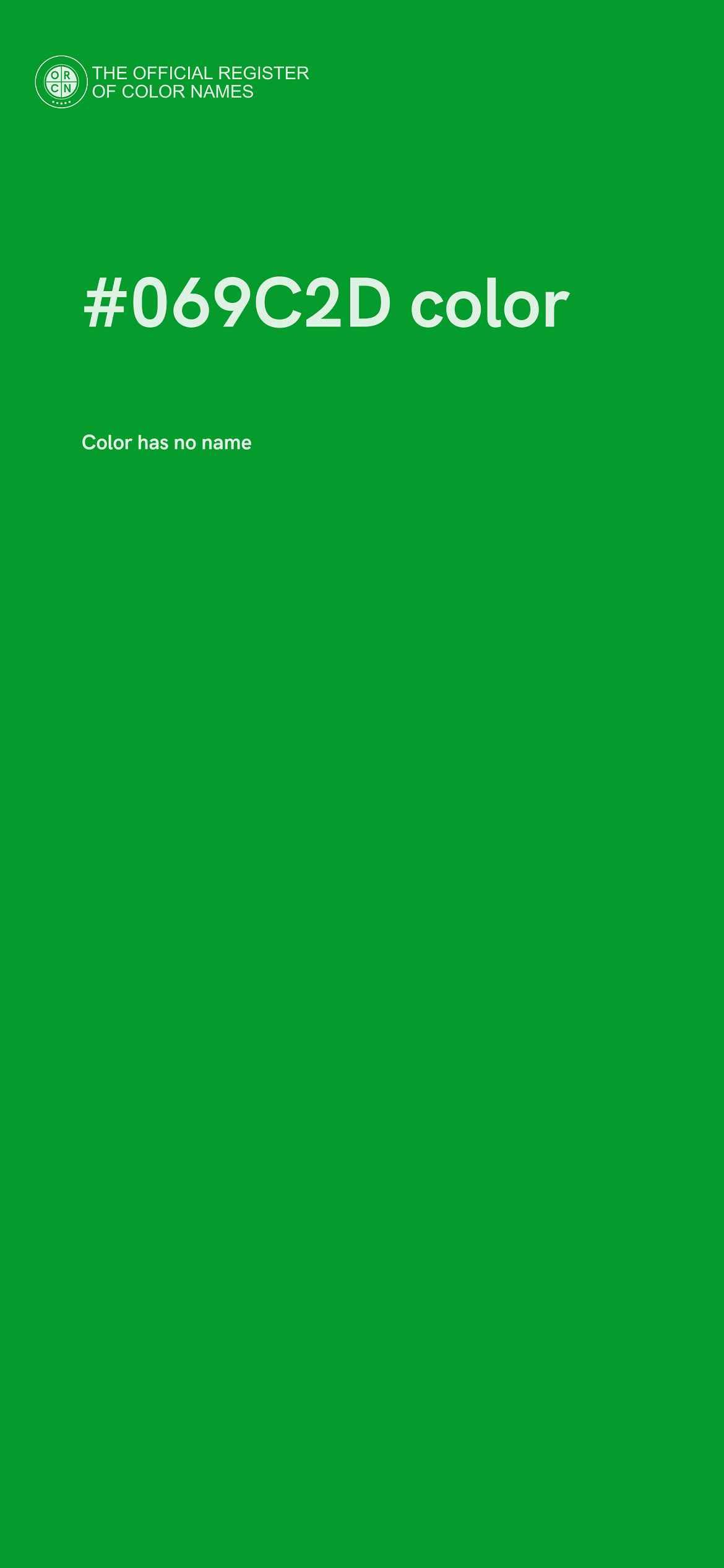 The digital color HEX #069C2D belongs to the Spring Green Color Family featuring Full Saturation (Saturation Family) and Neutral (Brightness Family).