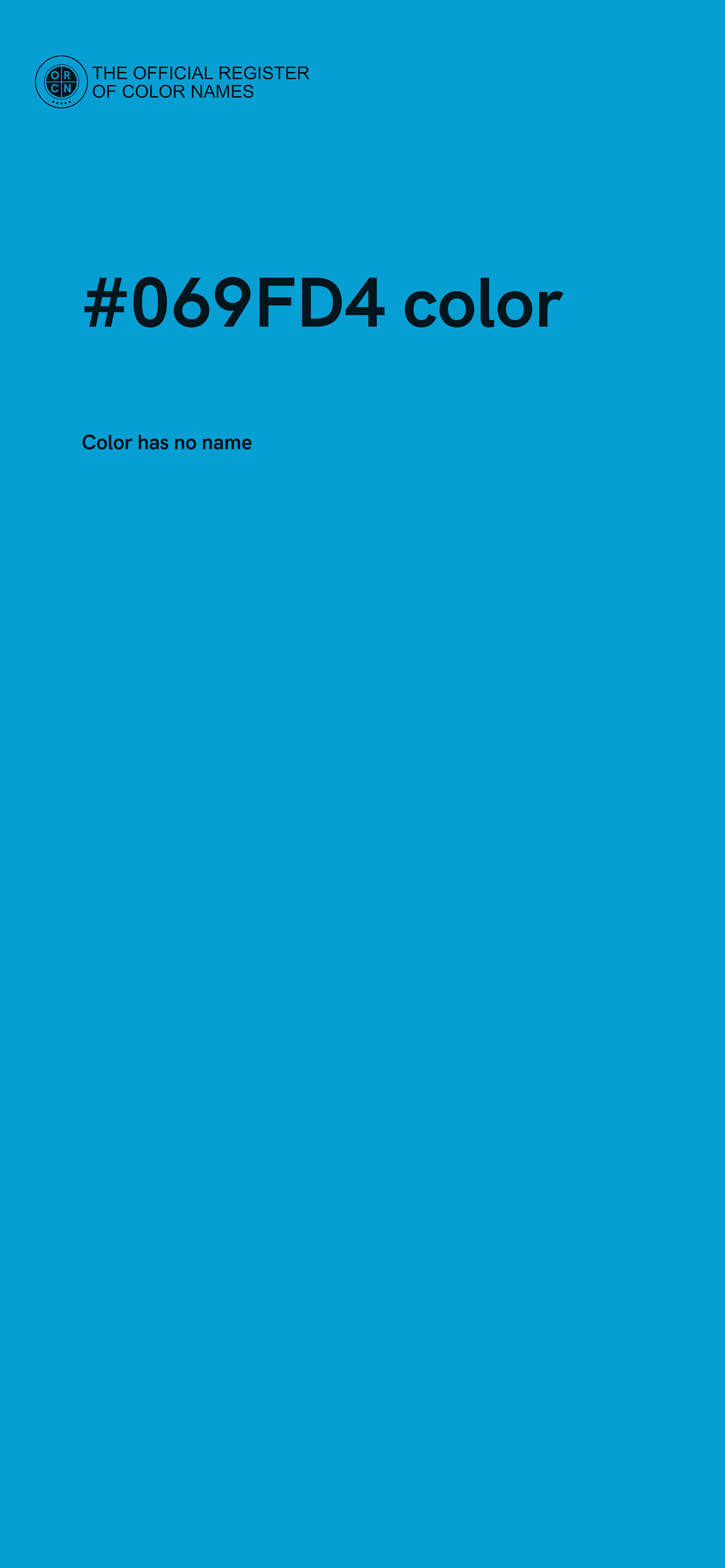 The digital color HEX #069FD4 belongs to the Azure Color Family featuring Full Saturation (Saturation Family) and Light (Brightness Family).