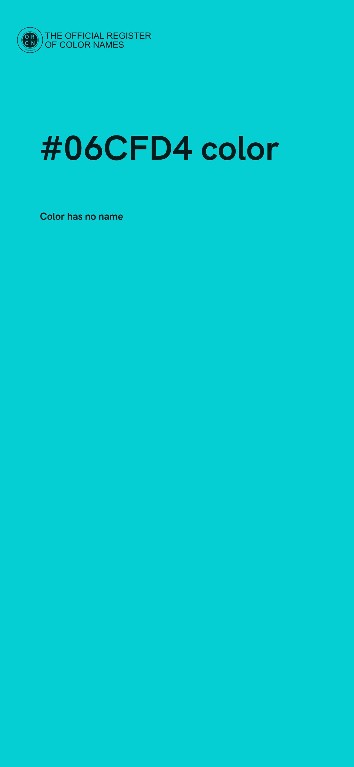 The digital color HEX #06CFD4 belongs to the Cyan Color Family featuring Full Saturation (Saturation Family) and Light (Brightness Family).