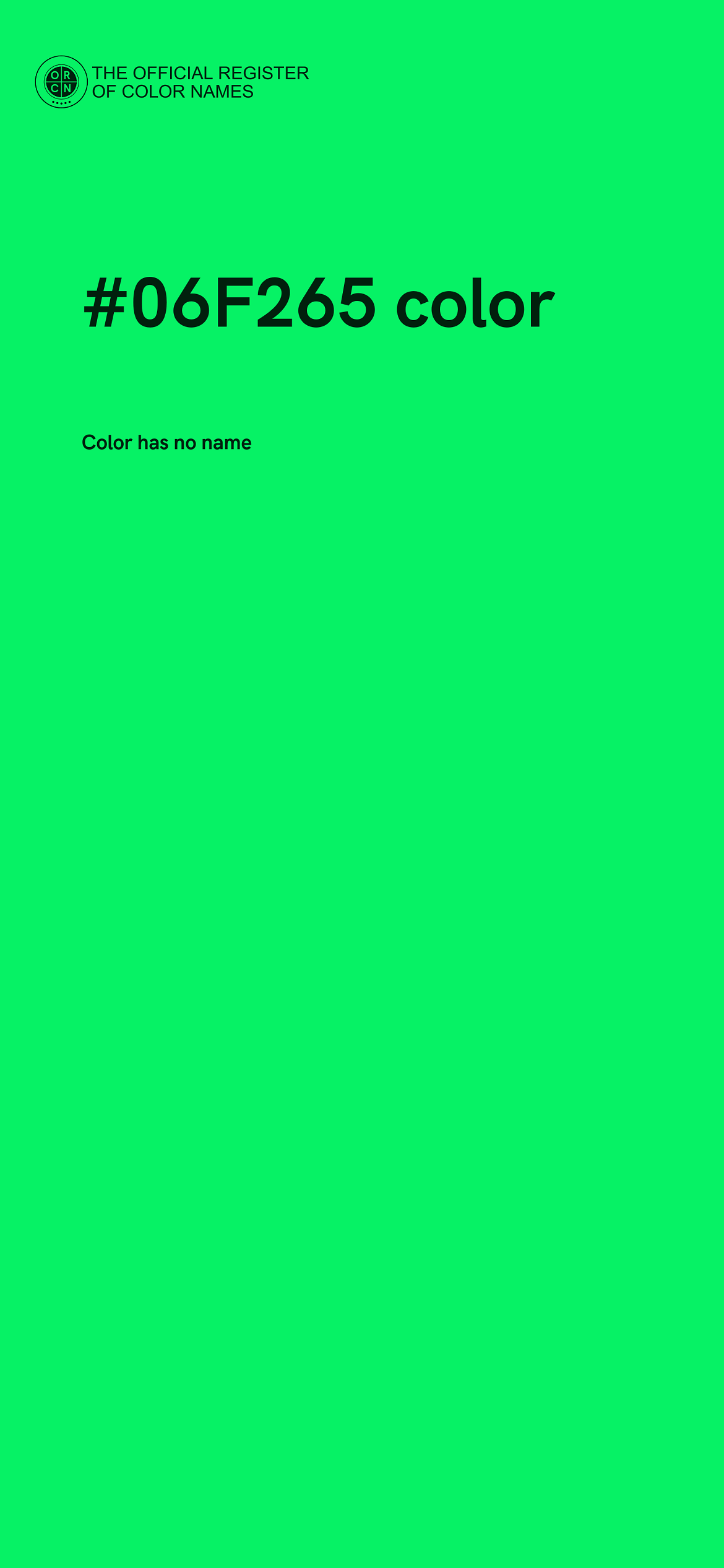 The digital color HEX #06F265 belongs to the Spring Green Color Family featuring Full Saturation (Saturation Family) and Light (Brightness Family).