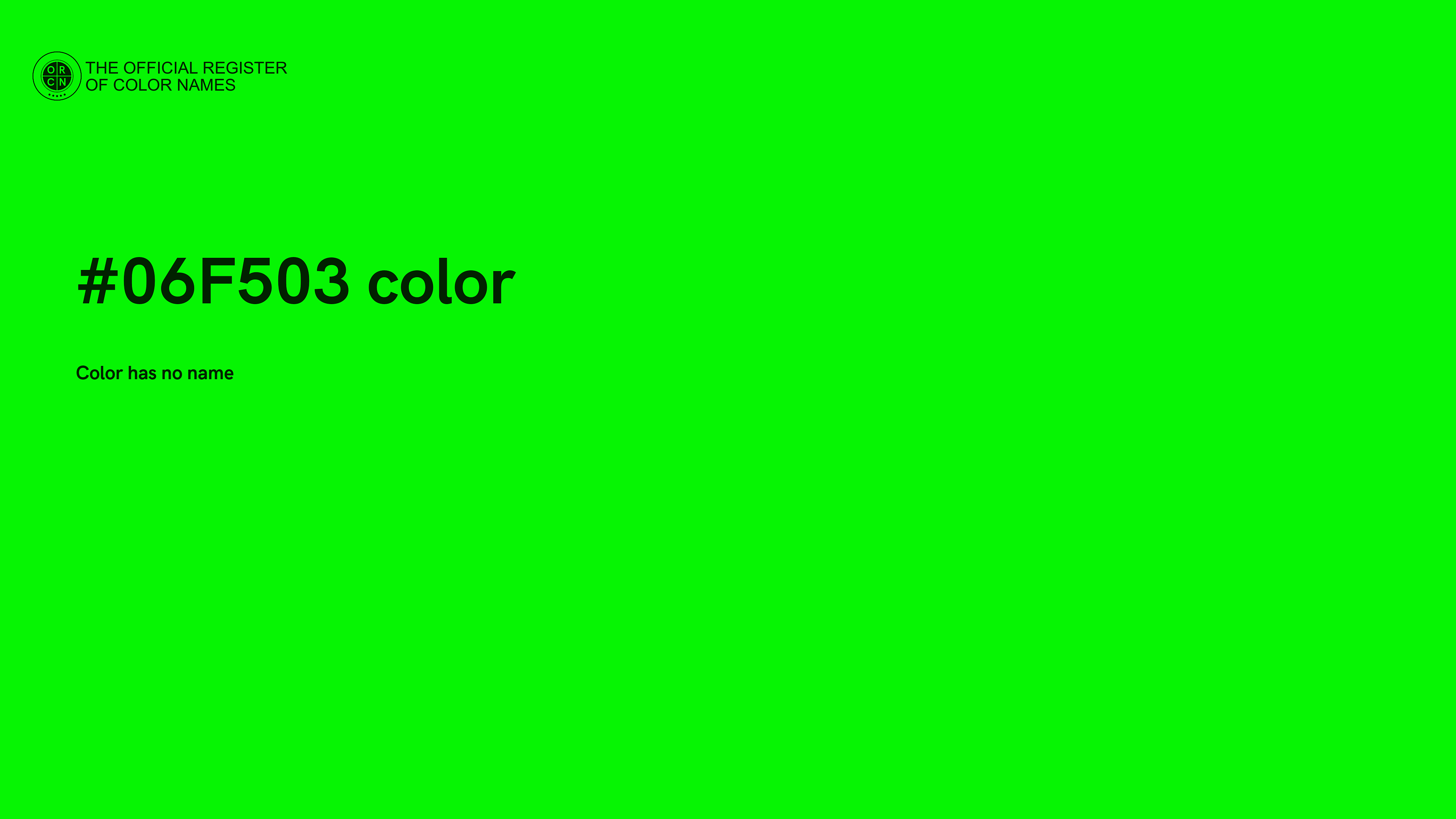 For printing in non digital world, #06F503 is represented in CMYK as 94 Cyan, 0 Magenta, 95 Yellow, and 4 Black (Key) (C:94 M:0 Y:95 K:4).
