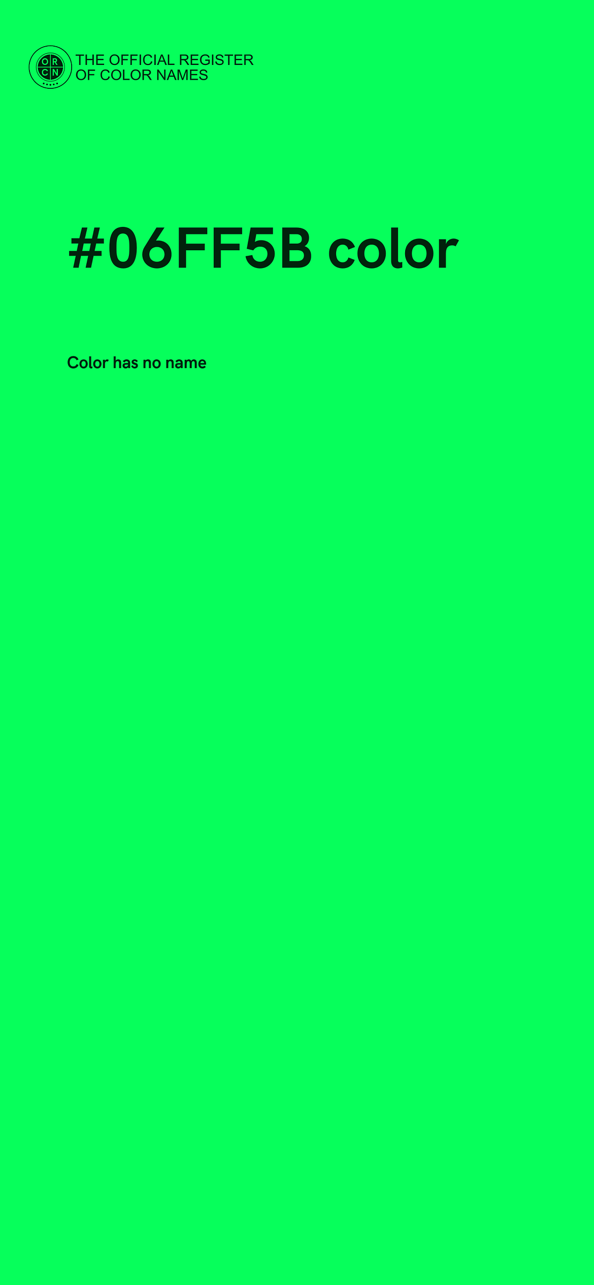 The digital color HEX #06FF5B belongs to the Spring Green Color Family featuring Full Saturation (Saturation Family) and Light (Brightness Family).