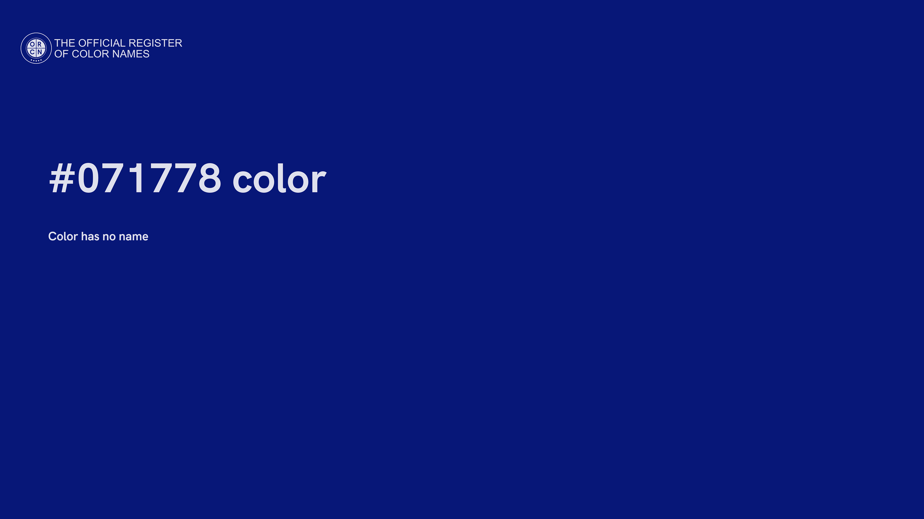 The digital color HEX #071778 belongs to the Blue Color Family featuring Full Saturation (Saturation Family) and Neutral (Brightness Family).