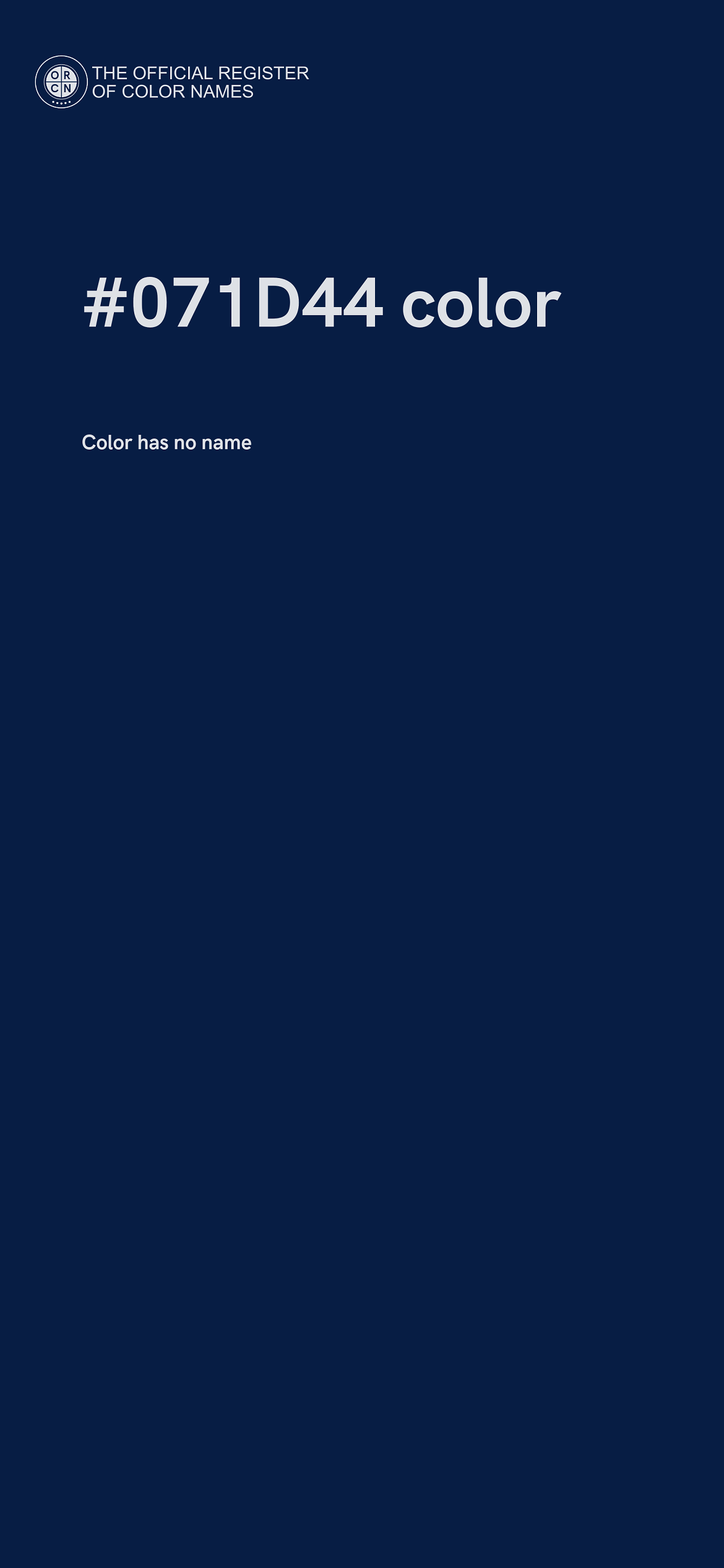 The digital color HEX #071D44 belongs to the Azure Color Family featuring High Saturation (Saturation Family) and Dark (Brightness Family).