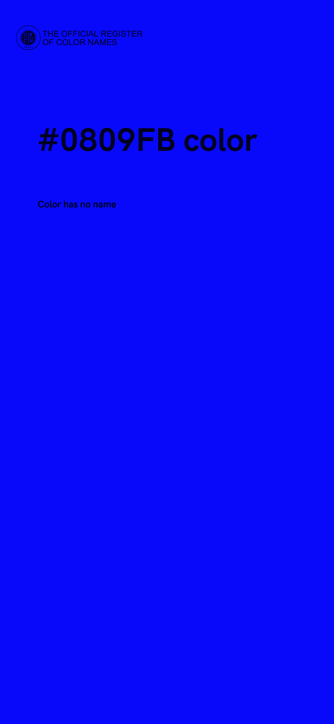 The digital color HEX #0809FB belongs to the Blue Color Family featuring Full Saturation (Saturation Family) and Light (Brightness Family).