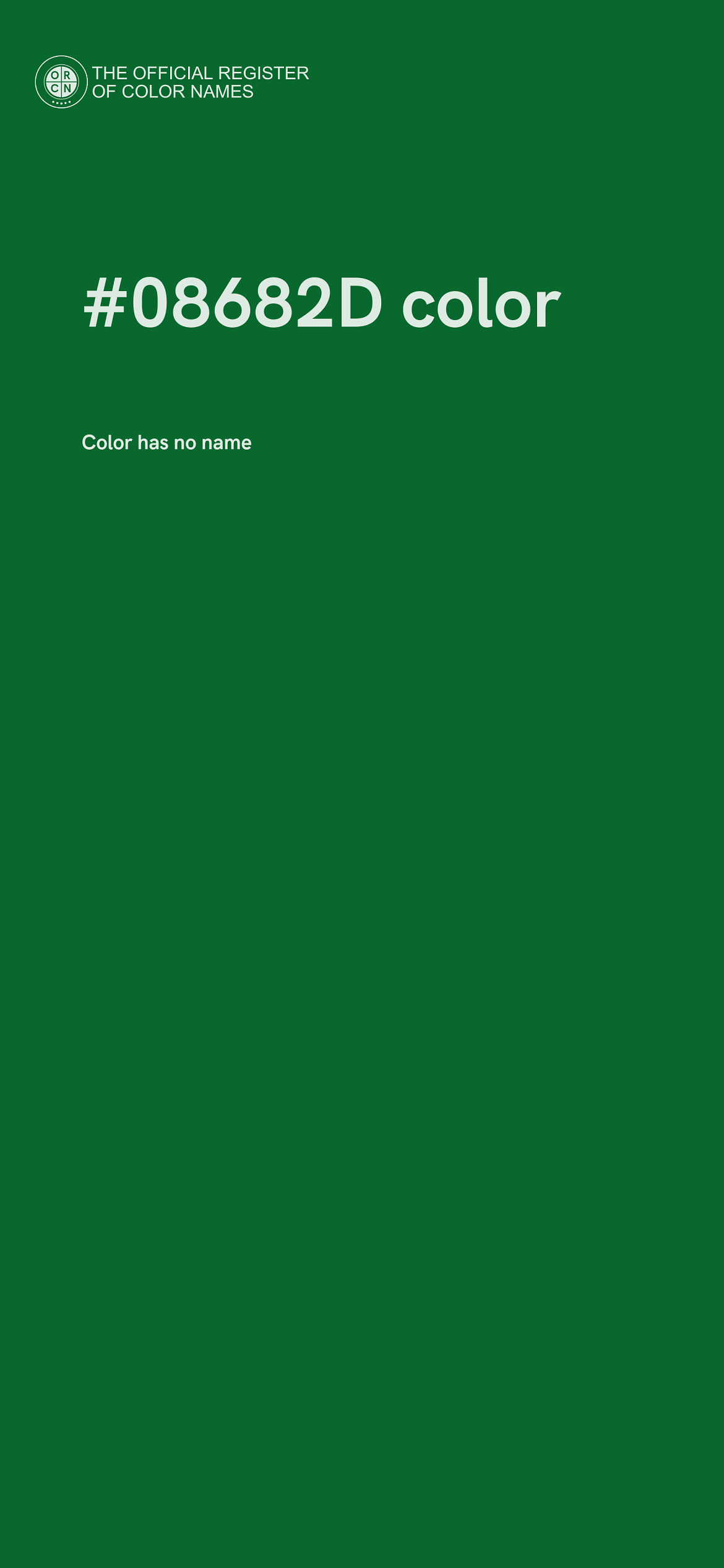 The digital color HEX #08682D belongs to the Spring Green Color Family featuring Full Saturation (Saturation Family) and Dark (Brightness Family).