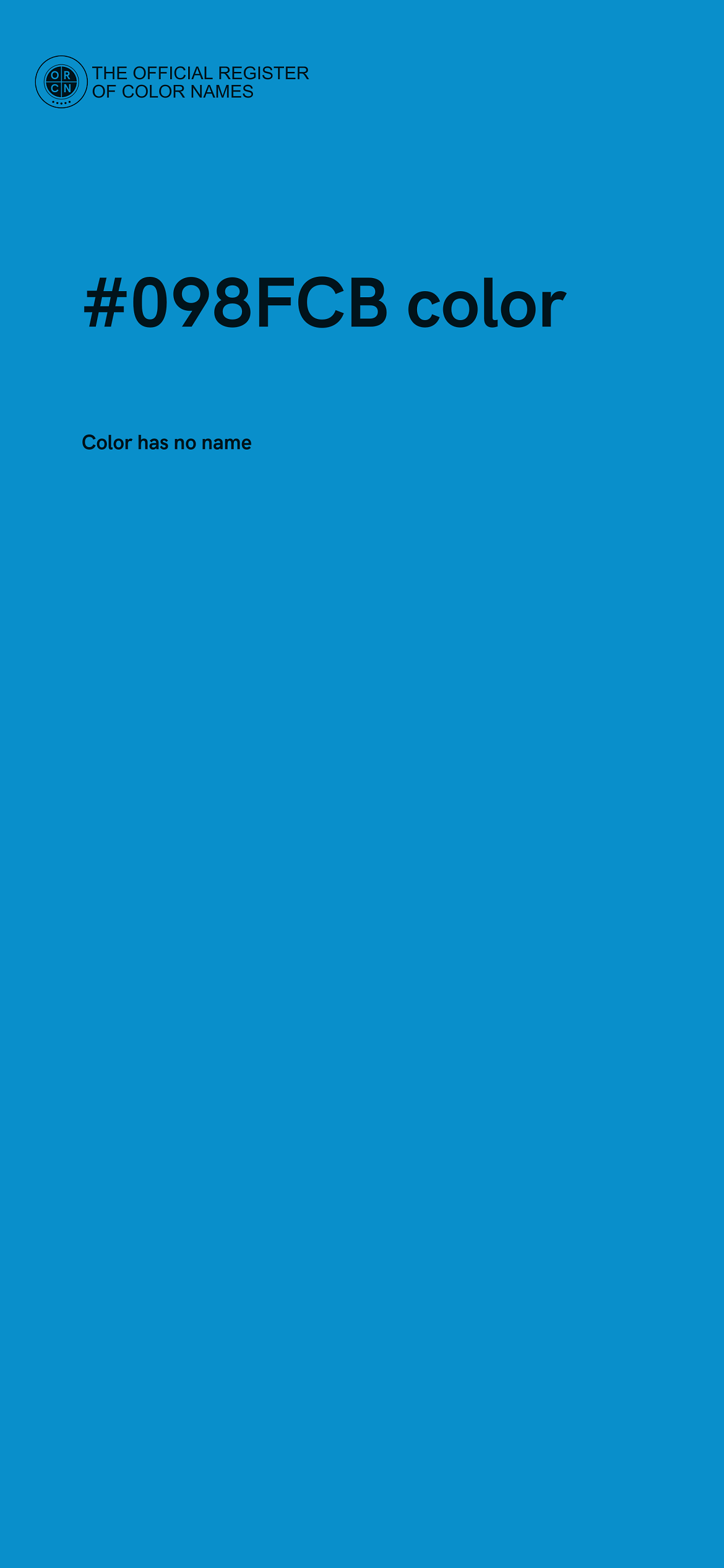 The digital color HEX #098FCB belongs to the Azure Color Family featuring Full Saturation (Saturation Family) and Light (Brightness Family).