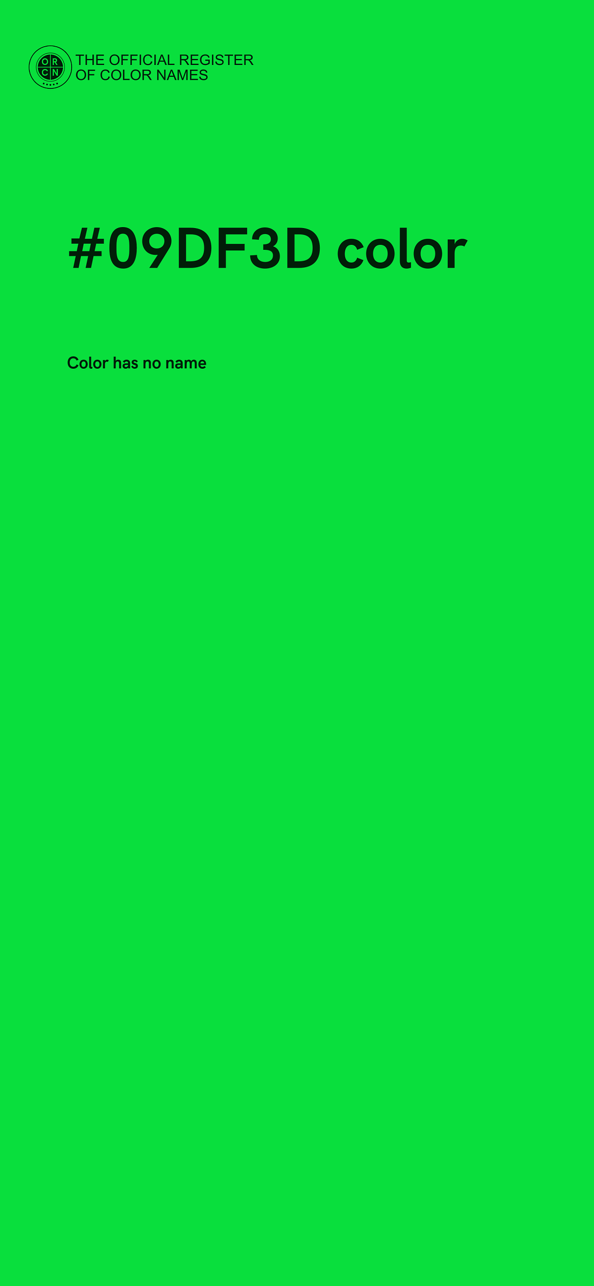 The digital color HEX #09DF3D belongs to the Spring Green Color Family featuring Full Saturation (Saturation Family) and Light (Brightness Family).