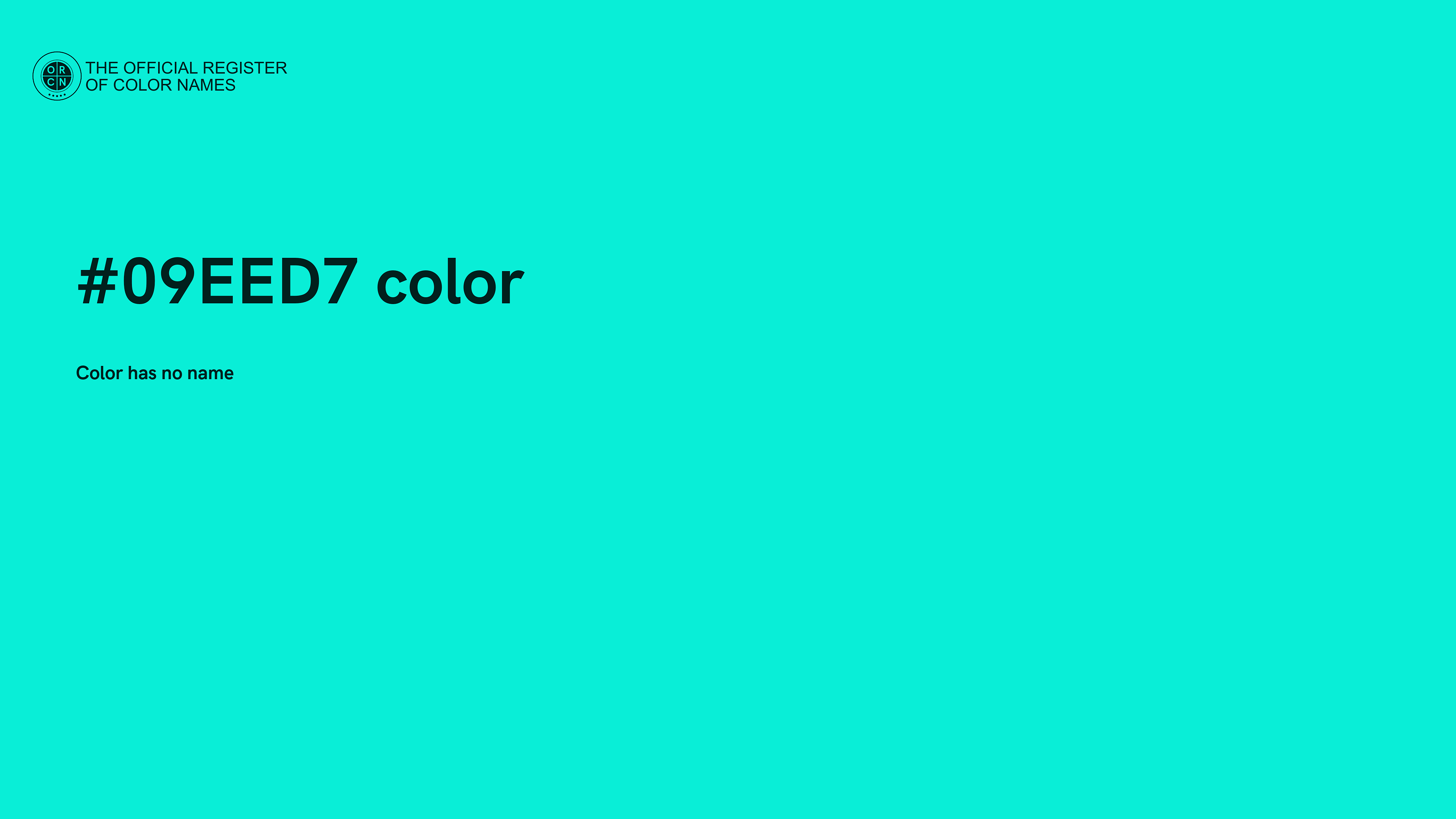 The digital color HEX #09EED7 belongs to the Cyan Color Family featuring Full Saturation (Saturation Family) and Light (Brightness Family).