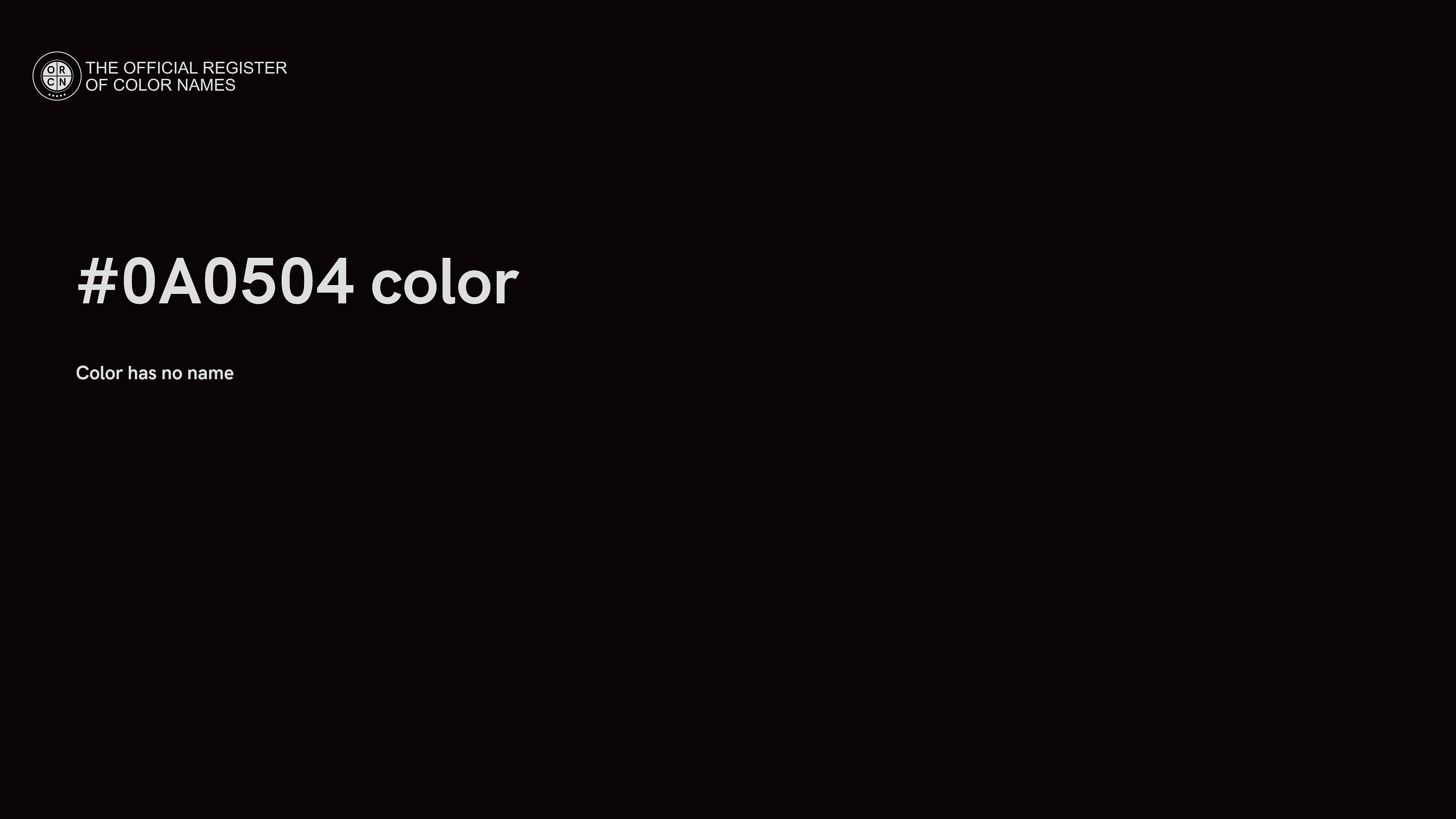 The digital color HEX #0A0504 belongs to the Red Color Family featuring Moderate Saturation (Saturation Family) and Very Dark (Brightness Family).