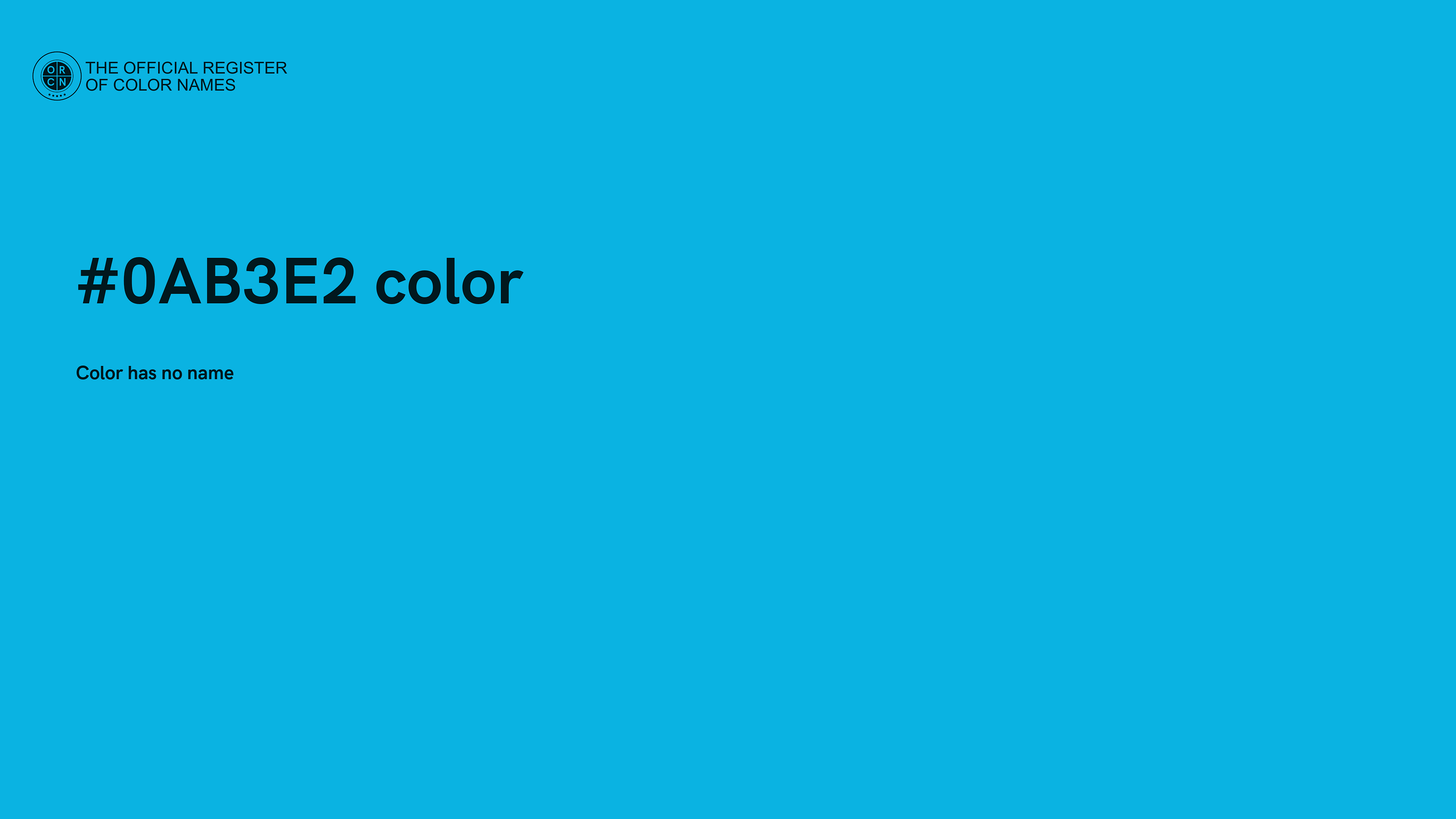 HEX code #0AB3E2 represent the color in hexadecimal format by combining three values – the amounts of Red, Green and Blue (RGB). Its RGB composition is 10, 179, 226 ( rgb(10, 179, 226) ), which breaks down into 3.9% of Red, 70.2% Green and 88.6% Blue.