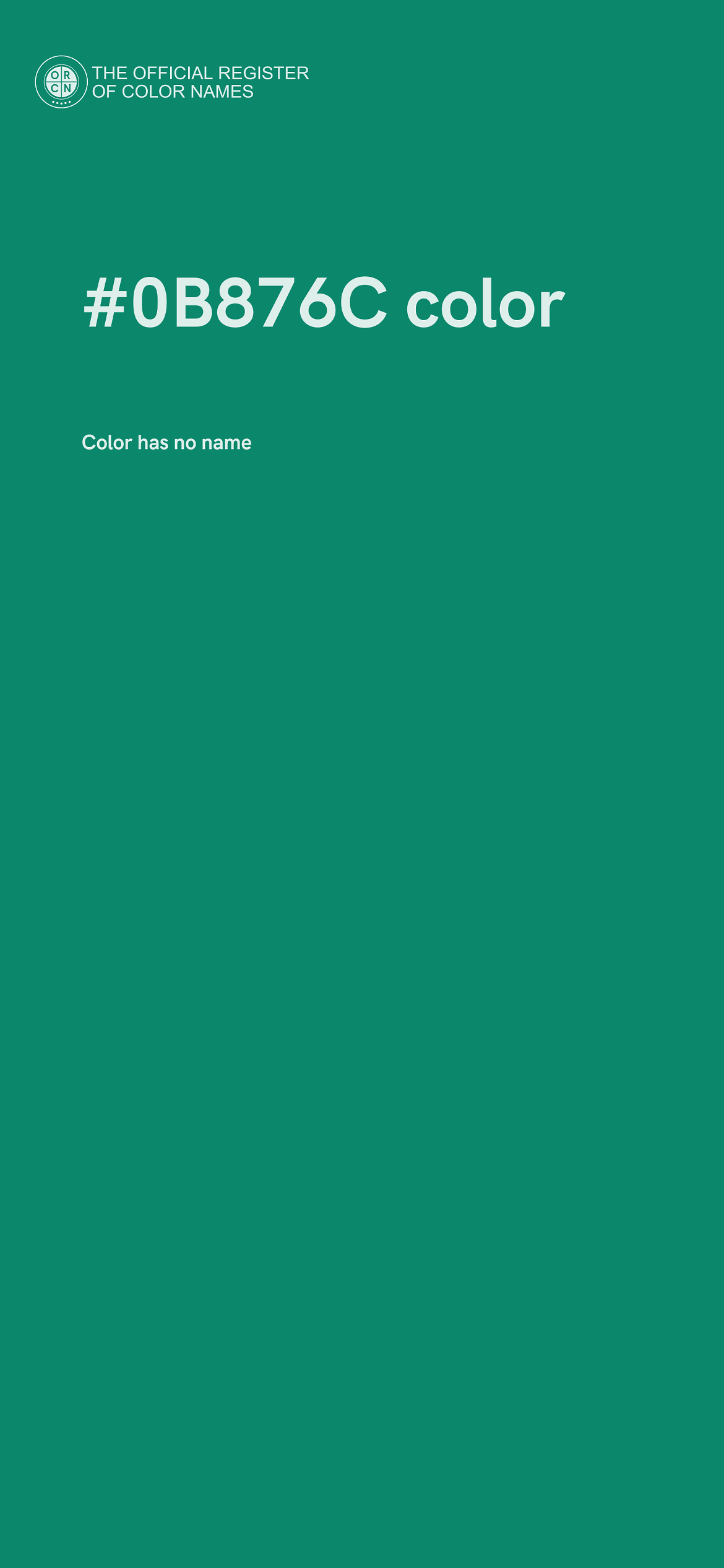 The digital color HEX #0B876C belongs to the Cyan Color Family featuring Full Saturation (Saturation Family) and Neutral (Brightness Family).