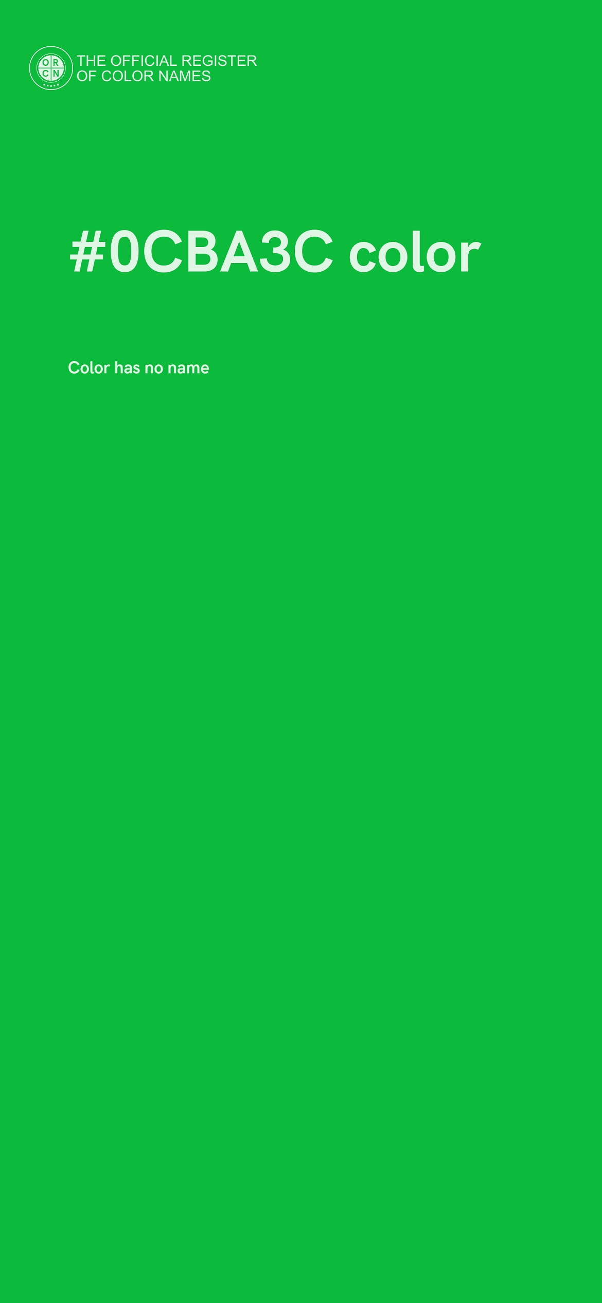 The digital color HEX #0CBA3C belongs to the Spring Green Color Family featuring Full Saturation (Saturation Family) and Neutral (Brightness Family).