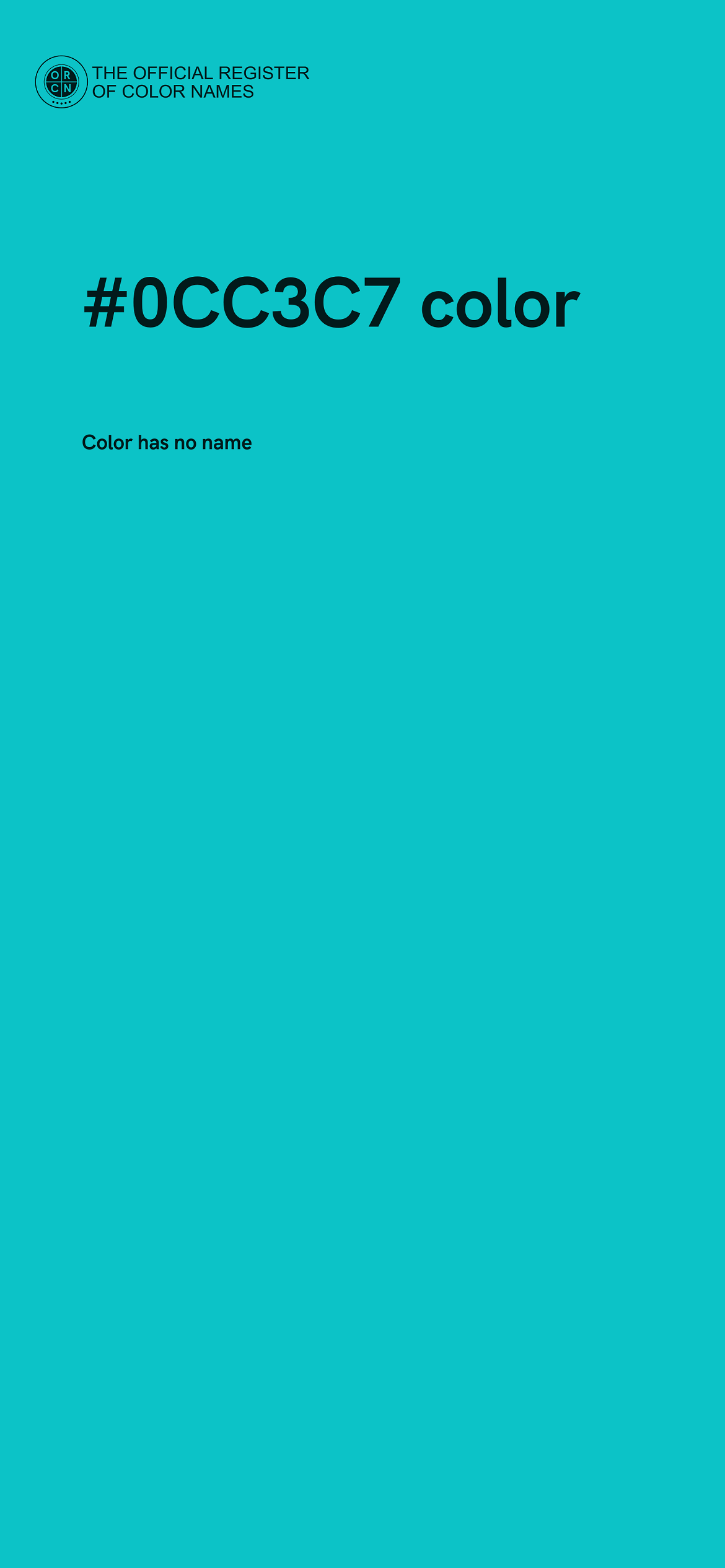 The digital color HEX #0CC3C7 belongs to the Cyan Color Family featuring Full Saturation (Saturation Family) and Light (Brightness Family).