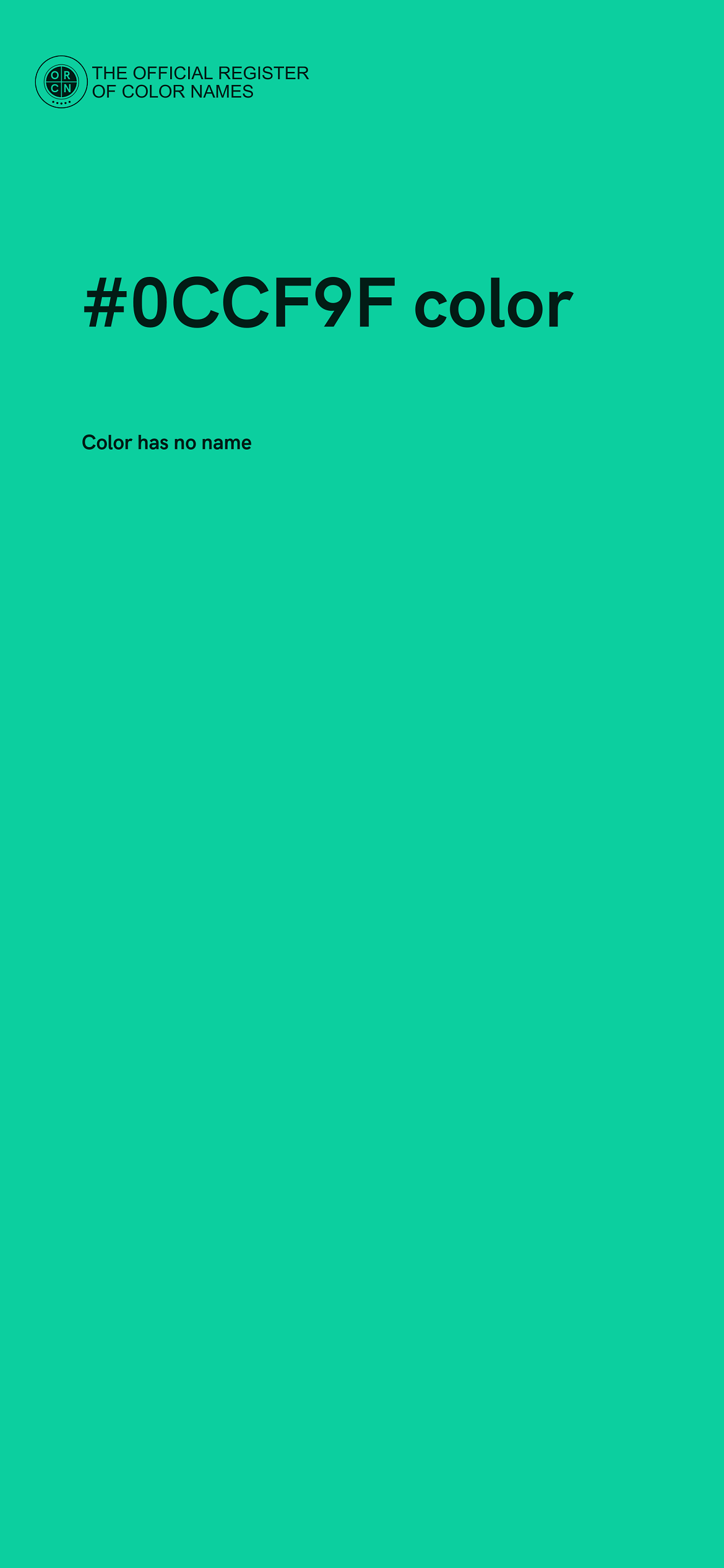 The digital color HEX #0CCF9F belongs to the Cyan Color Family featuring Full Saturation (Saturation Family) and Light (Brightness Family).