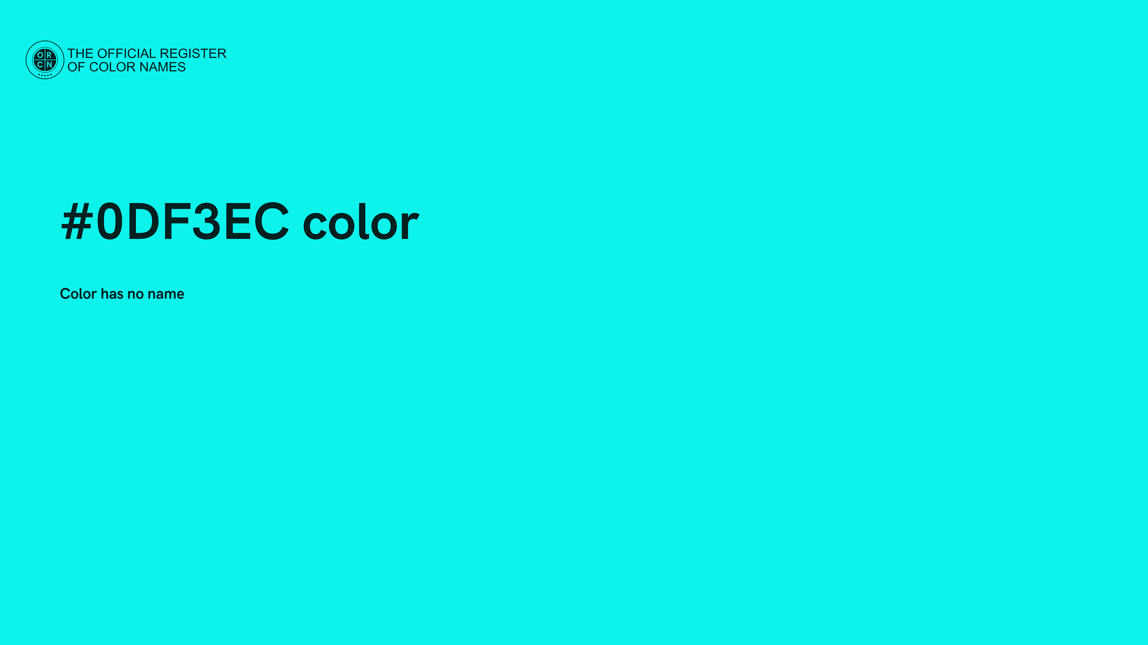 The digital color HEX #0DF3EC belongs to the Cyan Color Family featuring Full Saturation (Saturation Family) and Light (Brightness Family).