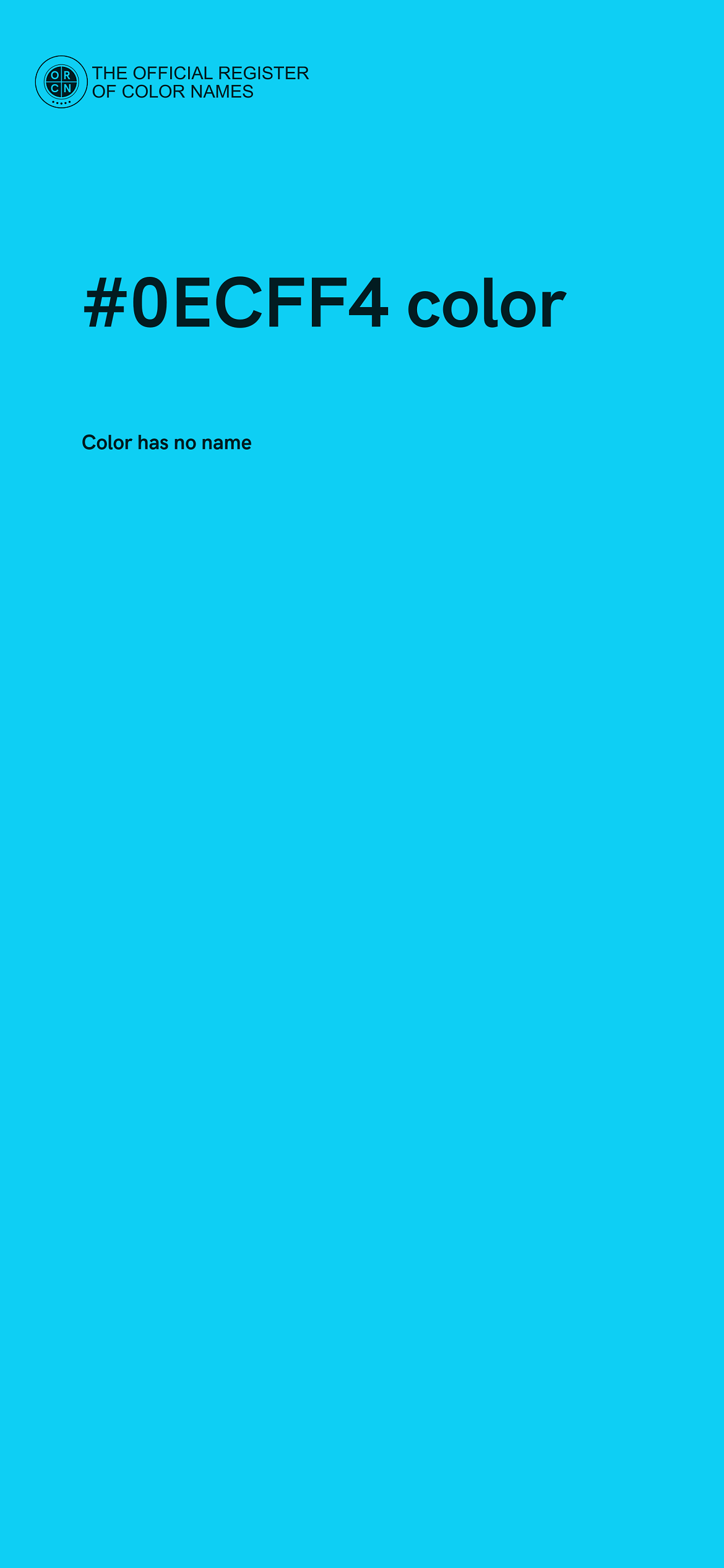 The digital color HEX #0ECFF4 belongs to the Cyan Color Family featuring Full Saturation (Saturation Family) and Light (Brightness Family).