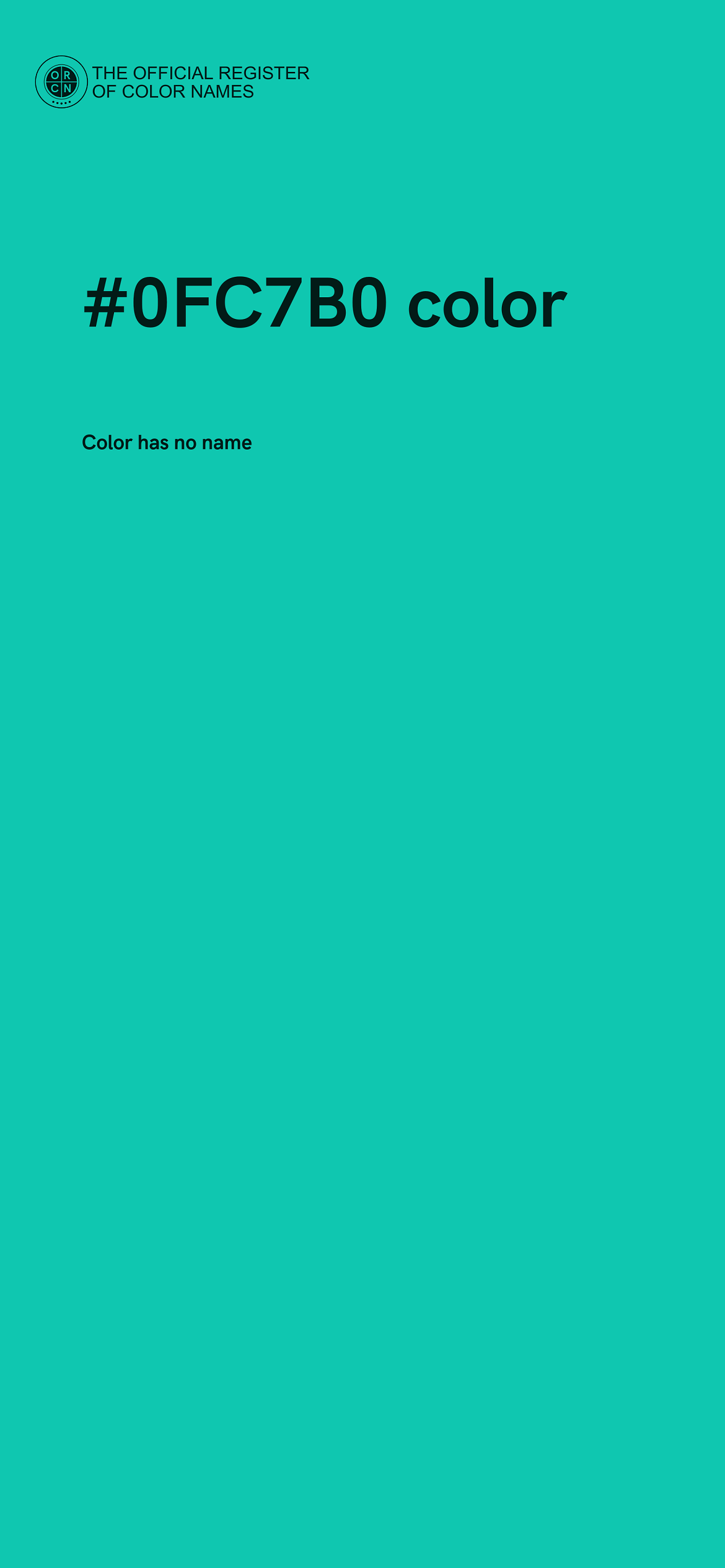 The digital color HEX #0FC7B0 belongs to the Cyan Color Family featuring Full Saturation (Saturation Family) and Light (Brightness Family).