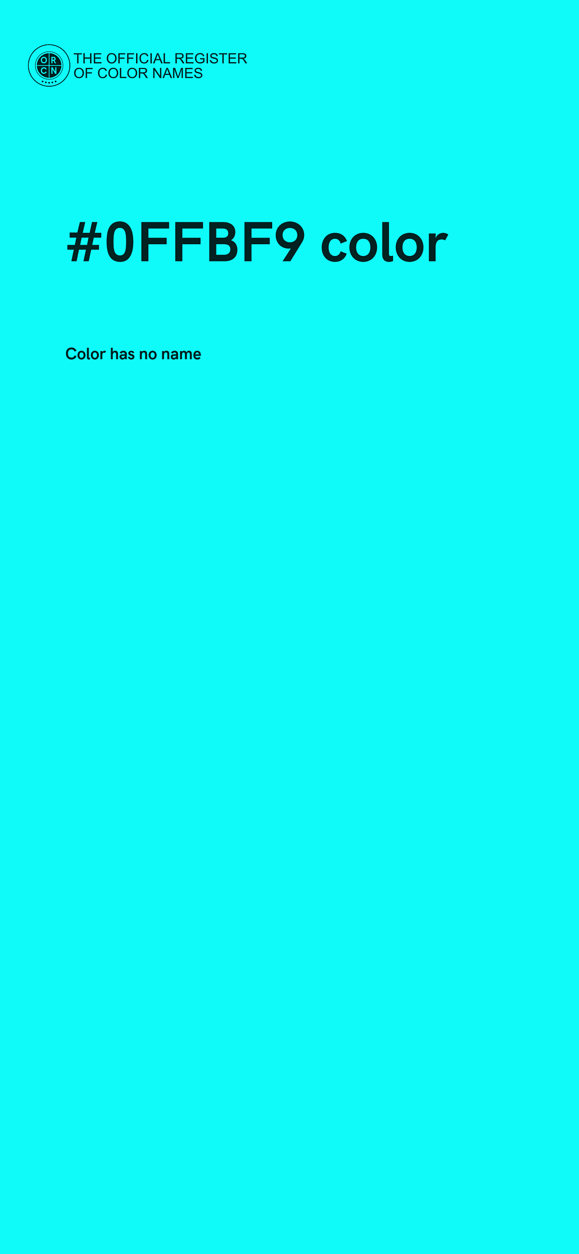 The digital color HEX #0FFBF9 belongs to the Cyan Color Family featuring Full Saturation (Saturation Family) and Light (Brightness Family).