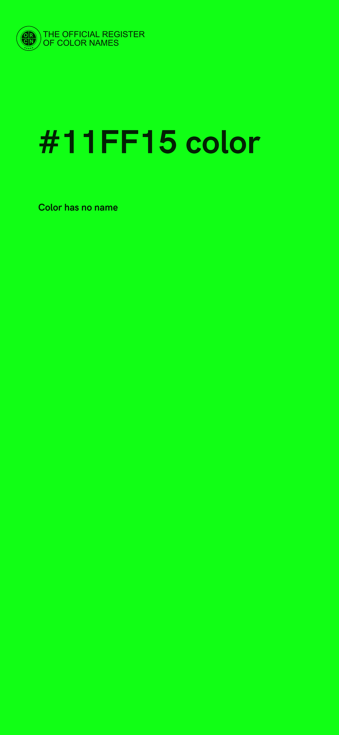 For printing in non digital world, #11FF15 is represented in CMYK as 93 Cyan, 0 Magenta, 92 Yellow, and 0 Black (Key) (C:93 M:0 Y:92 K:0).