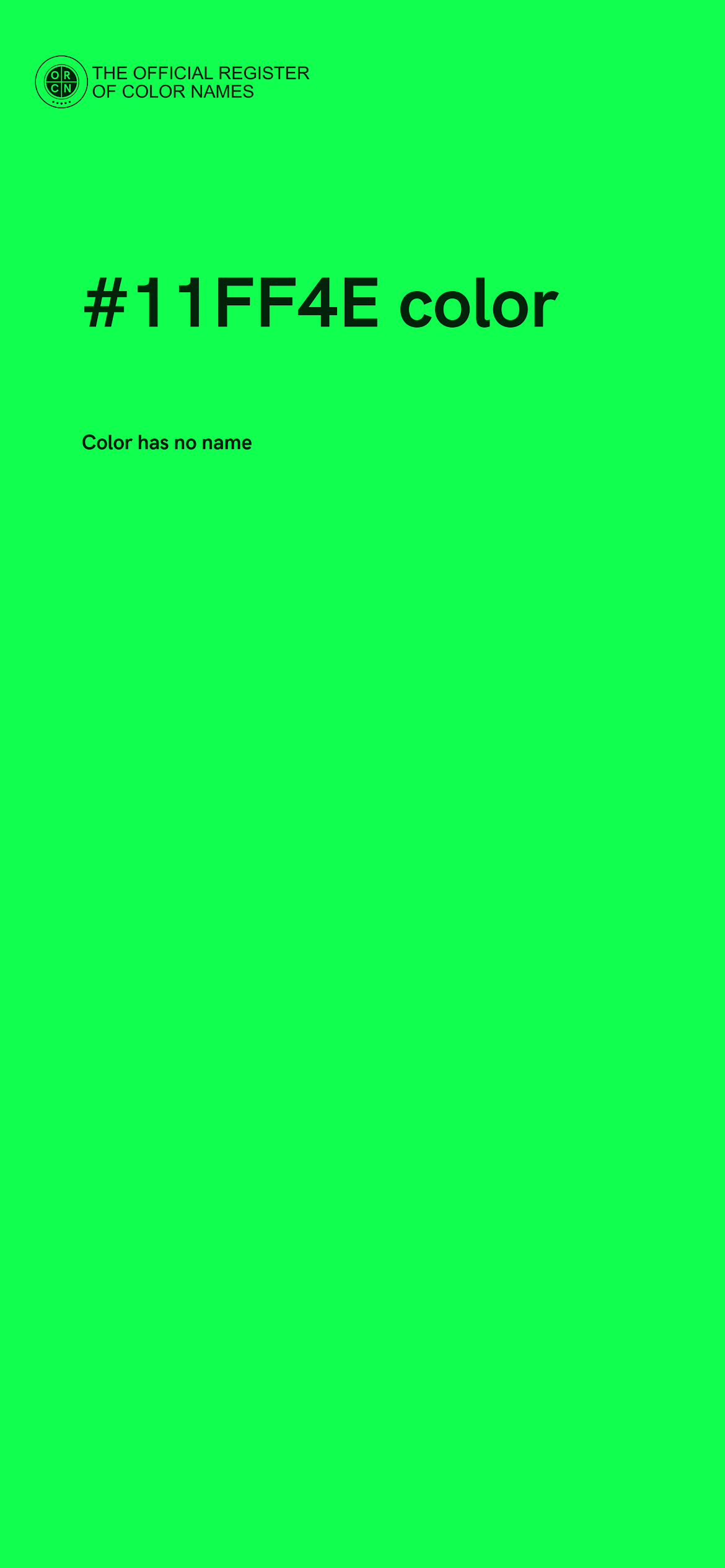 The digital color HEX #11FF4E belongs to the Spring Green Color Family featuring Full Saturation (Saturation Family) and Light (Brightness Family).