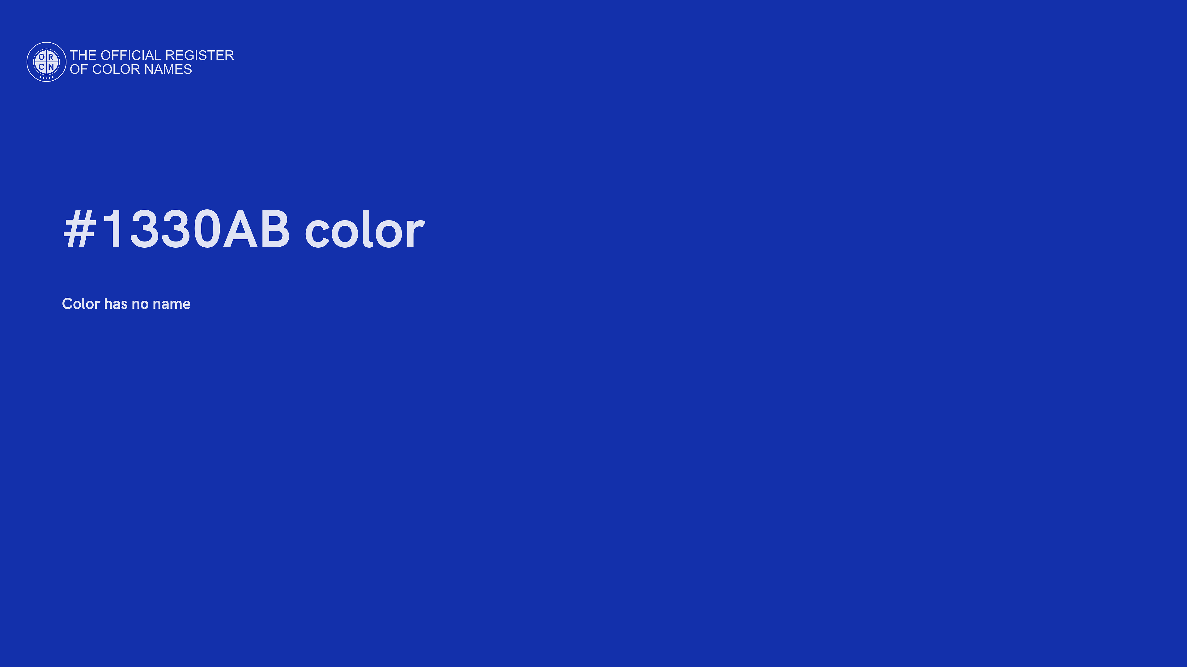 The digital color HEX #1330AB belongs to the Blue Color Family featuring High Saturation (Saturation Family) and Neutral (Brightness Family).