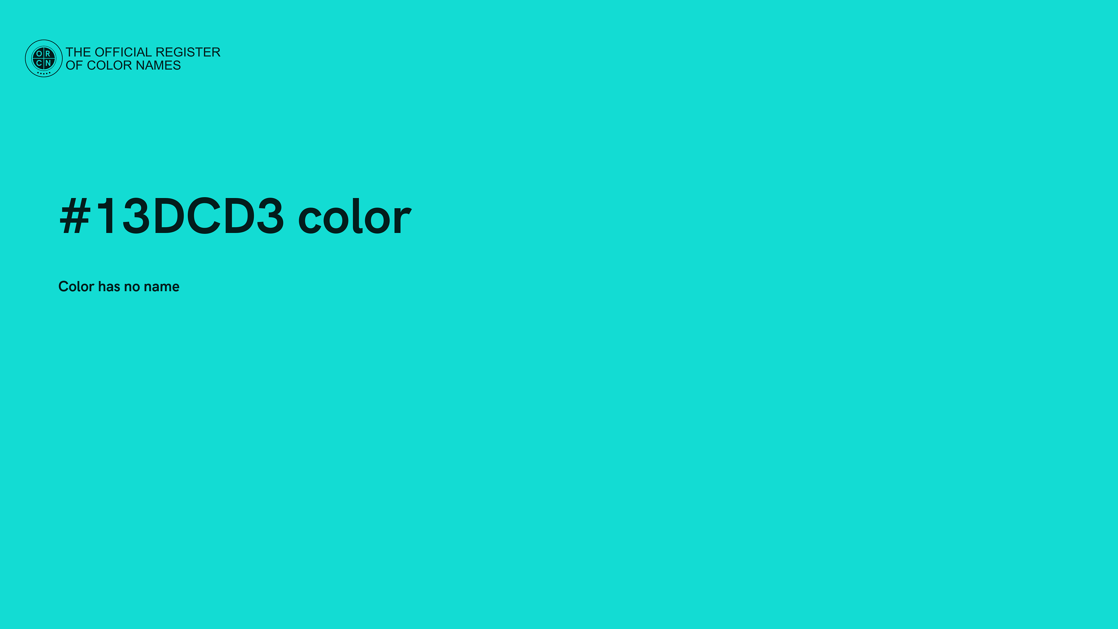 For printing in non digital world, #13DCD3 is represented in CMYK as 79 Cyan, 0 Magenta, 4 Yellow, and 14 Black (Key) (C:79 M:0 Y:4 K:14).