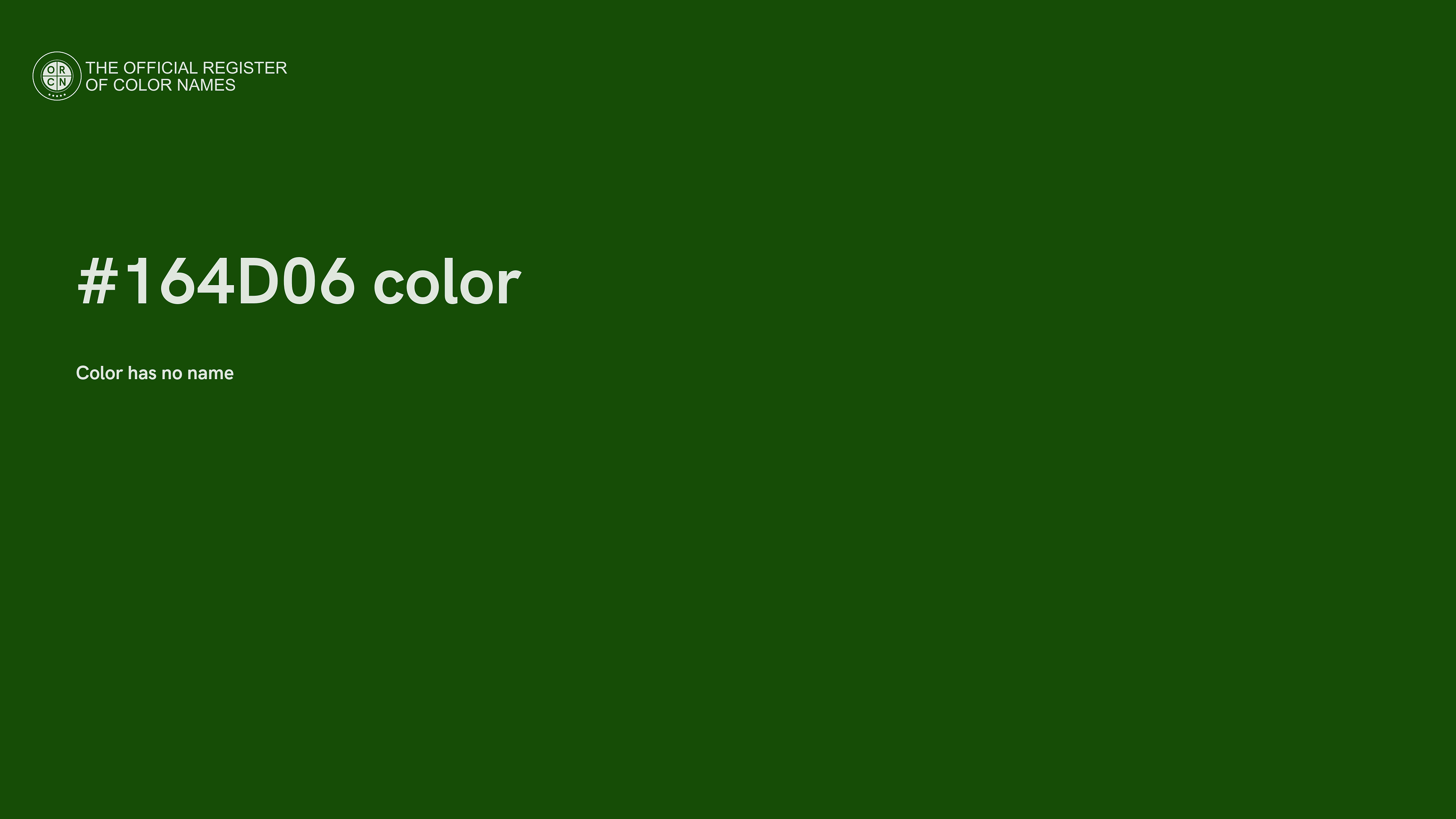 The digital color HEX #164D06 belongs to the Green Color Family featuring Full Saturation (Saturation Family) and Dark (Brightness Family).