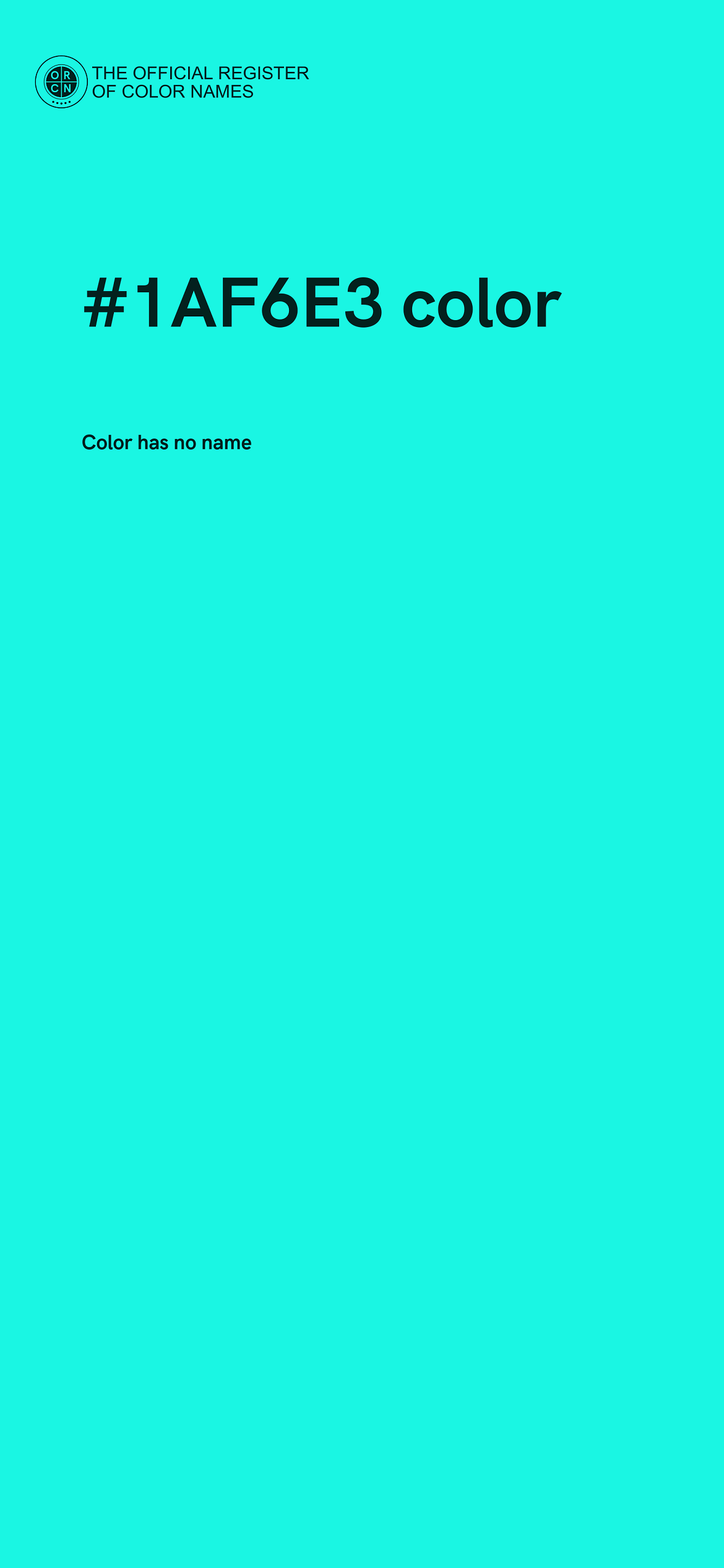 The digital color HEX #1AF6E3 belongs to the Cyan Color Family featuring Full Saturation (Saturation Family) and Light (Brightness Family).